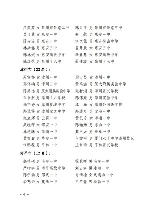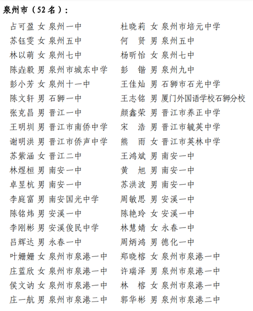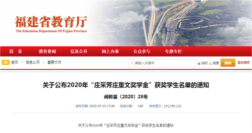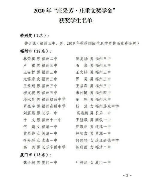 最新名单公示!!! 泉州52人上榜 牛!牛!牛! 7月15日 福建省教育厅官网公布 2020年“庄采芳庄重文奖学金” 获奖学生名单 全省共评出获奖学生201名 泉州有52名学生 光荣上榜!!! 赶紧看看有你认识的吗? 恭喜了! 泉州这些上榜的同学 期盼你们不辜负期望 再接再厉 取得更优异的成绩 接下来 一起来看看这份通知原文和完整名单 ↓↓↓↓↓ 各设区市教育局、平潭综合实验区社会事业局,惠安县、泉港区教育局,厦门集美中学、福州一中、福建师大附中: 根据省教育厅、省国际文化经济交流中心《关于组织开展2020年第33届“庄采芳•庄重文奖学金”评选工作的通知》(闽教基〔2020〕15 号)精神,本届“庄采芳•庄重文奖学金”评选工作已经结束。在各地教育行政部门和学校选拔、推荐、公示的基础上,经审核,“庄采芳•庄重文奖学金”组委会共评出获奖学生201名。现将获奖名单予以公布,请即通知获奖者及其所在学校。 福建省教育厅 福建省国际文化经济交流中心 2020年7月13日 优秀!点赞! 再次恭喜!祝贺! 福建上榜的学生们! 庄采芳·庄重文奖学金 “庄采芳奖学金”是著名爱国人士、香港庄士集团创始人庄重文博士,以其父亲庄采芳的名义,于1988年经省政府批准在我省设立。1993年,庄重文博士逝世后,其子女庄绍绥、庄秀霞、庄秀娥、庄秀纯等人,继承父亲遗志,把“庄采芳奖学金”一直延续下来。 2008年,为纪念庄重文先生,“庄采芳奖学金”更名为“庄采芳·庄重文奖学金”,由省国际文化经济交流中心和省教育厅共同组织实施,每年在全省评定约200名应届高中毕业生,其中包括国际中学生奥林匹克学科竞赛金、银、铜奖的同学和品学兼优的三好学生。 据了解,成立30余年来,此项奖学金已累计奖励我省近7000名优秀高中毕业生,成为我省持续时间长、覆盖面大、影响深远的学生奖项,享誉海内外。 |