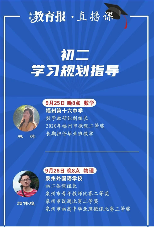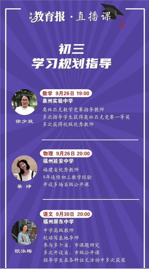 大家期待已久的 海峡教育报公益直播课 回来啦! 上一学年 由海峡教育报推出的 公益直播课 深受初二、初三师生关注和点赞 为帮助初二、初三生提高学习效率 新学期 我们继续开课 9月份 我们将对 新学期学习规划等 进行针对性的指导。 本周 公益直播课邀请 泉州实验中学、泉州外国语学校、福州屏东中学 福州延安中学、福州十六中等老师 为大家线上指导 如何听课学习? 关注【海峡教育报泉州在线】微信公众号, 初二发送“初二直播课” 初三发送“初三直播课” 获取直播链接! |