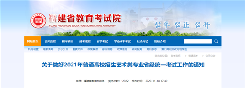 福建省教育考试院发布了 《关于做好2021年普通高校招生艺术类专业省级统一考试工作的通知》 2021年艺术类专业省级统考 定于2020年12月-2021年1月期间进行