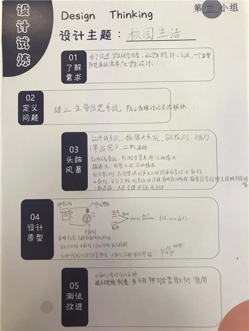 9个小组选择了不同的主题 并且提出了可操作性的解决方案 “智能黑板擦” 设计思路 为了解决学生擦黑板时擦不干净、粉尘多、易造成室内污染等一系列问题,初步设计了“智能黑板擦”。 智能黑板擦主要有三个功能:一是喷水。其两端分别设有许多密集的小孔,在其内部装满水,按下开关会产生水雾,可以快速将粉尘吸附,很大程度上改善了环境。二是吸尘。在黑板擦侧面分布着微型吸尘器,可以配合水雾吸收粉尘,并且其内部配有专门收集粉尘的盒子。一段时间后,将其拿出,通过一些方法将粉尘再化为粉笔,二次利用。三是其底部的毛刷用特殊材料制作,可在喷水后清洁干净黑板。 “智能黑板擦”外观简洁、功能新颖。在后续设计中,还可在其能量提供方面再创新。可利用太阳能供电。再者,可设计蓝牙连接,那人就可以远程操作黑板擦,可利用手的动作隔空擦黑板。