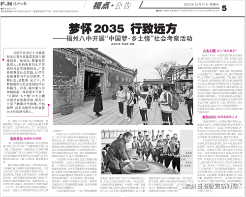 海峡教育报讯 习近平总书记十分重视和关注青年在基层实践中锻炼成长。他指出,要重视实践育人,坚持教育同生产劳动和社会实践相结合,广泛开展各类社会实践,让学生在亲身参与中认识国情、了解社会,受教育、长才干,不断拓展学生社会实践的平台和路径。 日前 福州第八中学组织高一年段学生 开展了 “中国梦·乡土情”六大主题 大型社会考察活动 助力八中学子 触摸时代脉搏,开拓视野 成长为能担当民族复兴大任的时代新人