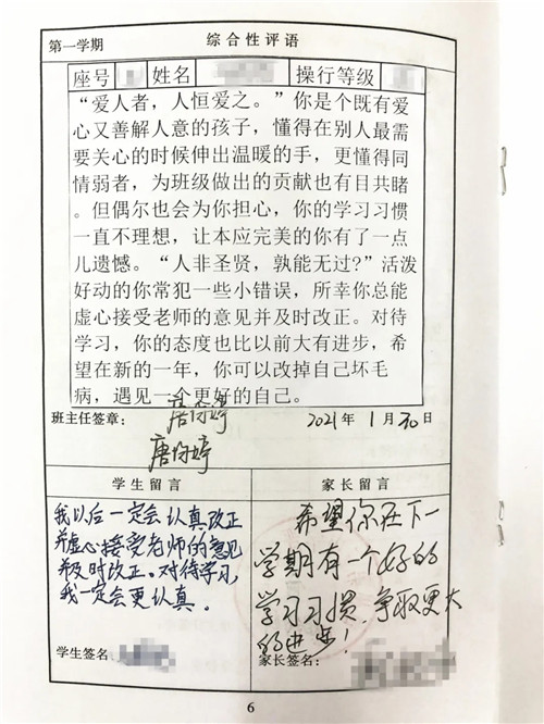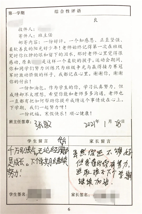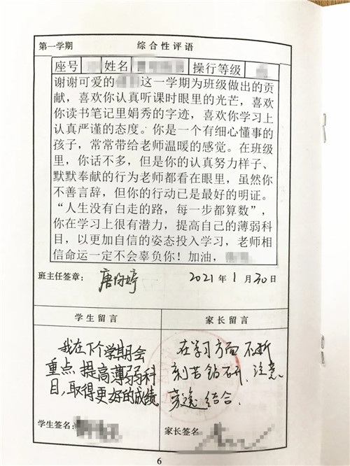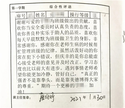 “有了班主任的温暖字句,成绩单带给孩子们的不再只是冷冰冰的分数。这些评语就像一颗播撒在孩子们心中的种子,随着他们的成长,在心里生根发芽。”学校德育处负责人陈艳燕老师表示,希望这样的评选活动,能激励老师们认真对待评语撰写这项工作,把温暖传递给每一位同学。 其他优秀评语展示 愿所有的孩子 都能在爱的浇灌下 成长为参天大树! (图片由学校提供) |