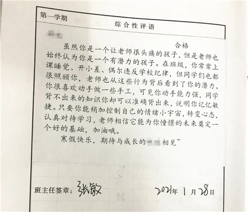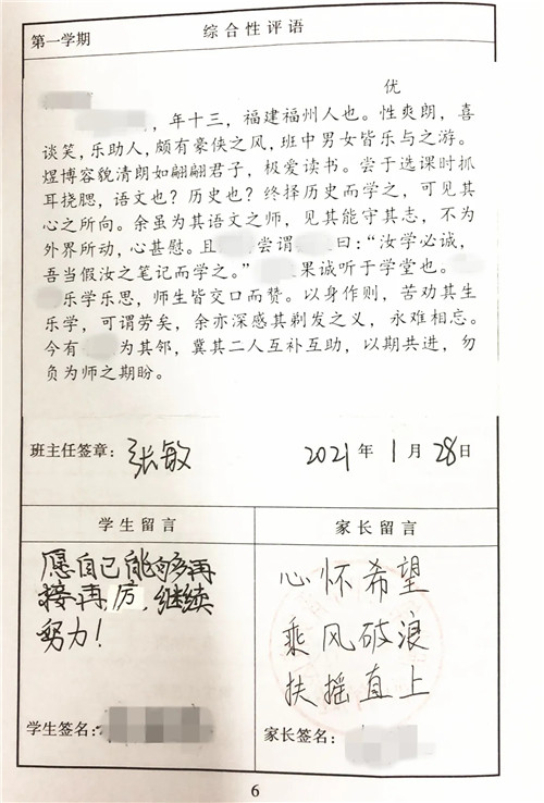 小林,年十三,福建福州人也 性爽朗,喜谈笑,乐助人,颇有豪侠之风 容貌清朗如翩翩君子,极爱读书 …… 收件人:小毅 寄件人:班主任 邮寄内容:一份好评…… 文言文,寄书信 你见过这样的教师评语吗? 近日,福州第三中学晋安校区德育处开展“优秀评语”评选活动,对上一学期期末的教师评语进行赋分,选出一、二、三等奖。在参与评选的评语中,有一位老师的评语格外引人注目。 来看看这位老师的评语 评语原文:***,年十三,福建福州人也。性爽朗,喜谈笑,乐助人,颇有豪侠之风,班中男女皆乐与之游。**容貌清朗如翩翩君子,极爱读书。尝于选课时抓耳挠腮,语文也?历史也?终择历史而学之,可见其心之所向。余虽为其语文之师,见其能守其志,不为外界所动,心甚慰。且**尝谓**曰:“汝学必诚,吾当假汝之笔记而学之。”**果诚听于学堂也。**乐学乐思,师生皆交口而赞。以身作则,苦劝其生乐学,可谓劳矣,余亦深感其剃发之义,永难相忘。今有**为其邻,冀其二人互补互助,以期共进,勿负师之期盼。 评语原文: 收件人:*** 寄件人:班主任 邮寄内容:一份好评。一个知感恩、正直坚强、柔软善良的阳光好少年!老师始终记得第一次在班级哭时你红肿的眼和留下的泪水,那时老师心里觉得很感动,原来**是这样一个柔软的孩子。运动会期间,你和同学们努力训练只为班级争光与赢得接力赛冠军时激动骄傲的样子,我都记在心里。谢谢你,谢谢你的付出! 一份加油包。作为学生的你,学习认真努力,但成绩却不太理想,希望你能和老师多多沟通,老师也一直都有把如何帮助你提升成绩这个事情放在心上。星光不问赶路人,时间不负有心人。下学期,我们一起努力呀! 一份祝福。寒假快乐!顺心健康! 以上两段评语均来自学校的张敏老师,她告诉记者,自己还是学生的时候,收到期末评语总是特别兴奋,期待看到老师对自己的评价。可大多数时候,老师的评语都是寥寥几句套话。对此,她不免有些失望和难过。“所以当我成为老师后,我决定认认真真写评语,希望孩子们能从评语中看到老师对他们的期许和鼓励。”