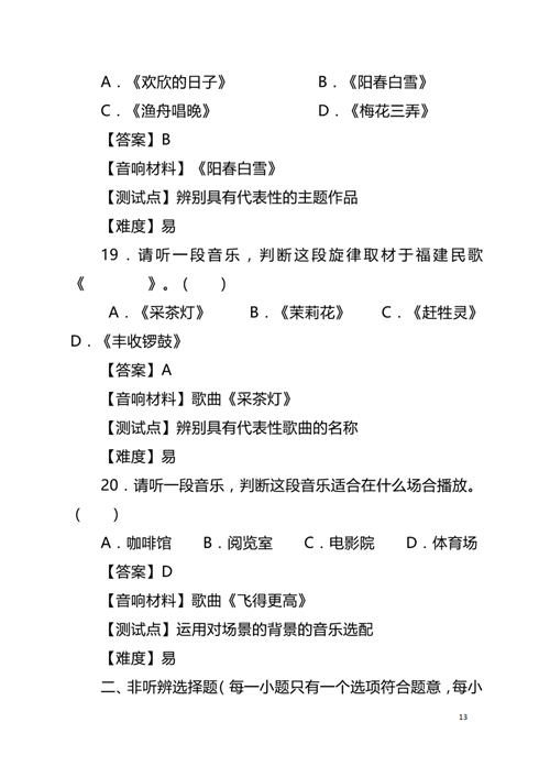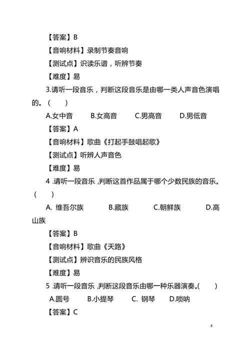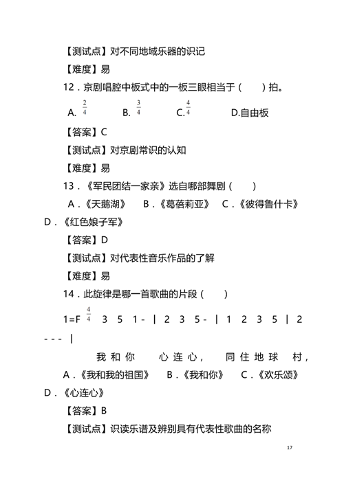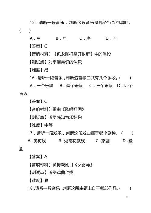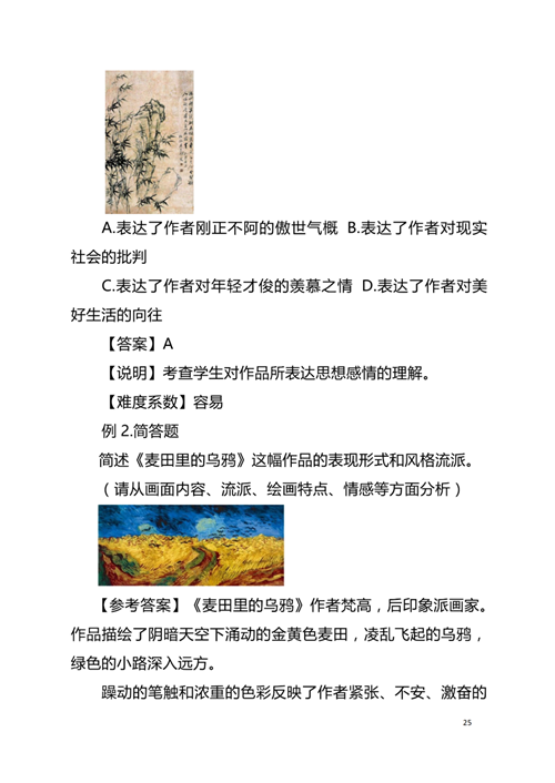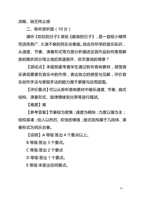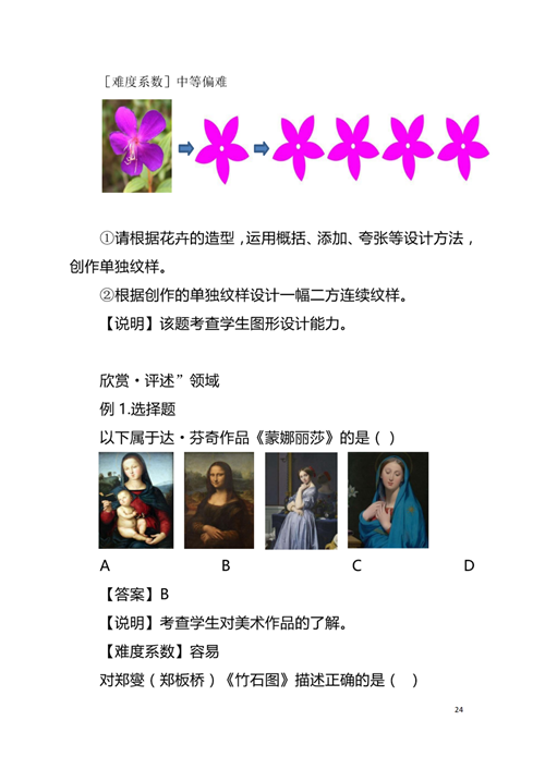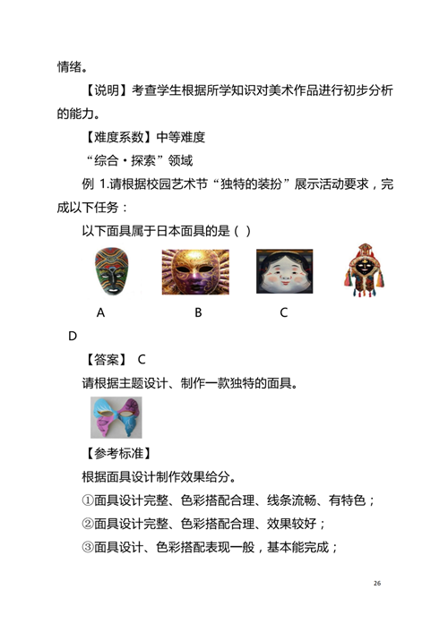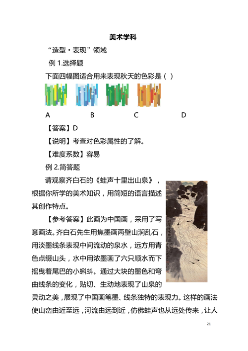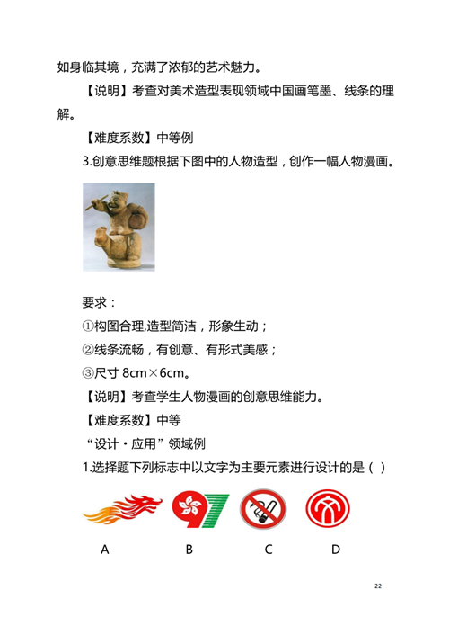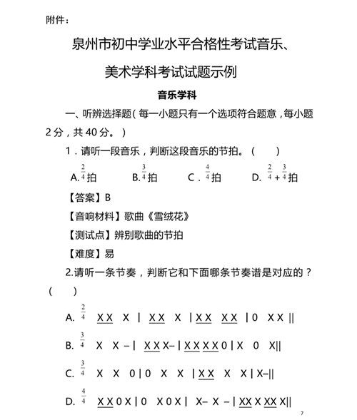 海峡教育报讯 近日,为贯彻落实中共中央国务院关于深化新时代教育评价改革精神,根据教育部、福建省教育厅和泉州市有关考试招生制度改革意见要求,结合泉州市实际,泉州市教育局印发了《泉州市初中学业水平合格性考试音乐、美术学科考试指导意见(试行)》。 考试内容与方式 一 考试内容 1.音乐学科 音乐学科命题内容依据《义务教育音乐课程标准(2011年版)》《福建省教育厅关于印发福建省义务教育美术和音乐学科教学指导意见(试行)的通知(闽教基〔2018〕94号)》和我市现行初中音乐教材七至九年级课程的要求,着重考查音乐学科基础知识和基本技能,发挥音乐学科的美育功能和音乐学科考试的正确导向。 命题范围为音乐学科的4个领域(“感受与欣赏”“表现”“创造”“音乐与相关文化”)。其中音乐基础知识与欣赏主要考察学生的音乐听辨能力、音乐作品赏析能力、音乐基础编创能力;表现采用演唱、演奏、综合艺术表演等进行考核,主要考察学生表现能力。 2.美术学科 美术学科命题内容依据《义务教育美术课程标准(2011年版)》《福建省教育厅关于印发福建省义务教育美术和音乐学科教学指导意见(试行)的通知(闽教基〔2018〕94号)》和我市现行初中美术教材七至九年级课程的要求,着重考查美术学科基础知识和基本技能,发挥美术学科的美育功能和美术学科考试的正确导向。 命题范围为美术学科的四个学习领域(“欣赏•评述”“造型•表现”“设计•应用”“综合•探索”)。其中,美术基础知识和基本技能考核主要考察美术的基本常识、基本理论知识、美术作品赏析能力、美术知识的生活运用能力;创作表现采用实操的方式进行考核,主要考察学生的美术基础能力、创作表现能力。 二 考试方式 1.基础知识卷面考试与技能测试结合。 (1)音乐学科:基础知识卷面考试80%,技能测试20%。卷面考试实行闭卷考试,考试时间不超过45分钟。技能测试根据各地各校的实际情况,建议由学生在“表现”领域的演唱、演奏及综合艺术性表演中自主选择任意一项进行测试,原则上每位学生的实际测试时间不超过5分钟。 (2)美术学科:基础知识卷面考试70%,技能测试30%。卷面考试实行闭卷考试,考试时间不超过45分钟。技能测试根据命题要求进行创作表现,命题内容以造型•表现、设计•应用为主,测试时间不超过30分钟。 2.卷面难度和考核方式 卷面考试试卷难度适中,难度系数比为8:1:1。考试可采用纸笔考试或与应用信息技术手段、借助网络平台辅助考试相结合的形式进行考核。 3.组织实施 各县(市、区)和学校结合学生平时学习表现进行综合评价,确定成绩。学校考试评价方案须经主管教育局审核同意,报市教育局核准备案后实施。鼓励考试实行校际交叉监考,由县(市、区)教育局组织过程巡视和成绩评定结果审核,市直学校的考试纳入学校所在地县(市、区)教育局统筹管理。鼓励有条件的县(市、区)统一组织实施。 考试对象和时间 一 考试对象 具有初中学籍的在校九年级学生均应参加初中音乐、美术学业水平考试。 二 考试时间 各县(市、区)教育局根据本县(市、区)实际情况制定考试方案并报市教育局核准后,学校自行组织九年级学生在4—5月份进行测试,鼓励有条件的各县(市、区)教育局组织学生统一在4—5月份进行测试,市直学校参加学校所在地县(市、区)教育局组织的考试。 三 其他情形考生 因病、残患有声带、听力、视力、语言障碍或双手残疾等特殊情况考生,可视病、残程度,申请免考音乐、美术学科考试。申请免考的考生须持三甲及以上医院诊断证明及就医病历等,或持市残联颁发的残疾证明,由本人提出申请,经学校初审通过后报所在地教育主管部门审核批准并予以公示,认定为符合免考的考生,科目考试成绩认定为“免考合格”。 本市户籍在外地就读的回泉州中考考生,报名时已在外地参加音乐、美术学科学业水平合格性考试且成绩合格的,相关成绩予以认可,不需要再参加本市组织的考试;未在外地参加学科学业水平合格性考试以及参加学科学业水平合格性考试但成绩不合格的考生,到户口所在地县(市、区)教育局报名后,直接参加所在地县(市、区)教育局或学校组织的学科学业水平合格性考试,考试未通过则成绩认定为不合格,不再组织补考。 考试成绩呈现方式与使用 考试成绩以“合格”与“不合格”呈现,并作为学生毕业和升学的基本依据。 试题示例 |