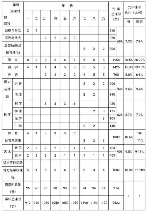 一、每学年52周。义务教育阶段每学年上课时间35周(包括社会实践等综合实践活动课);学校机动时间2周,由学校视具体情况自行安排,如文化节、运动会、远足等;复习考试时间2周(九年级下学期毕业复习时间增加2周);寒暑假、国家法定节假日共13周。普通高中每学年教学时间40周,社会实践(含研学实践)1周,假期(包括寒暑假、节假日和农忙假)11周。每学年分两学期,普高学校学期是否分学段安排课程,由学校根据本校各学科教学安排自主确定。