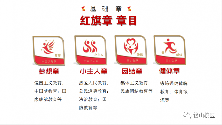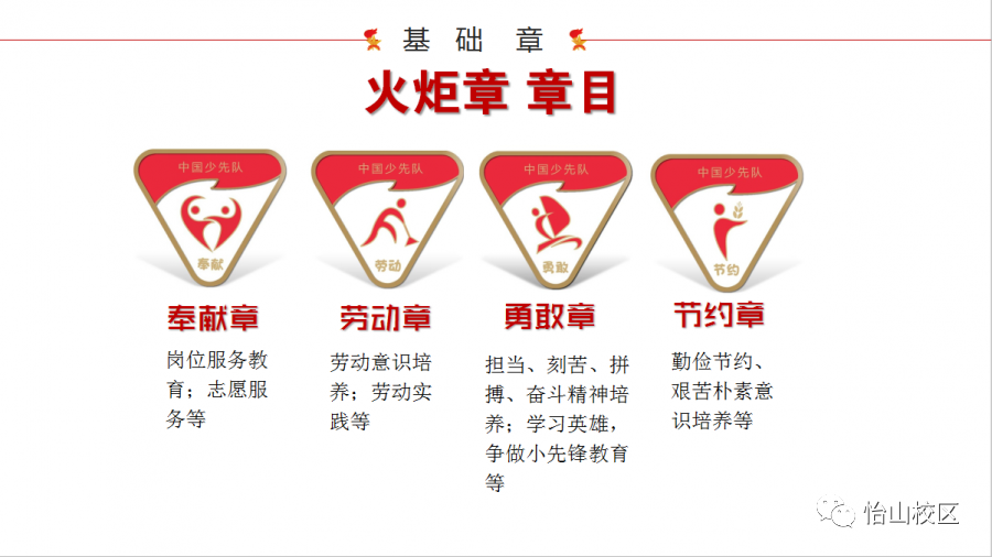 奖章设置 01基础章 基础章章目共设3个类别:红星章、红旗章、火炬章,根据3类章目内涵,下设12种基础章。“基础章”为必修章,是“红领巾奖章”的主体奖章。