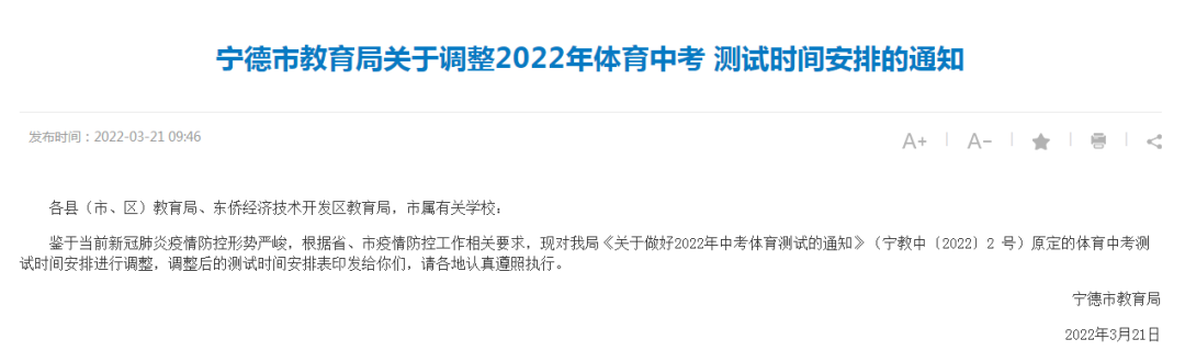 近日,宁德、泉州调整2022年体育中考时间,具体通知如下: 宁德 各县(市、区)教育局、东侨经济技术开发区教育局,市属有关学校: 鉴于当前新冠肺炎疫情防控形势严峻,根据省、市疫情防控工作相关要求,现对我局《关于做好2022年中考体育测试的通知》(宁教中〔2022〕2 号)原定的体育中考测试时间安排进行调整,调整后的测试时间安排表印发给你们,请各地认真遵照执行。 宁德市教育局 2022年3月21日 2022年各县(市、区)体育中考测试时间安排表(调整后) 备注: 1.各县(市、区)开始测试前一天,要会同测试服务单位开展裁判培训和设备调试。 2.测试期间如遇无法测试的天气(具体由各地判定),当天测试自动停止,已安排的测试时间顺延。同时,顺延的县(市)须告知下一站,以便其及时调整测试日程。 泉州 根据新型冠状病毒感染的肺炎疫情防控工作的要求,原定4月至5月进行的2022年泉州市初中毕业升学体育与健康考试延期,具体考试时间根据疫情防控进展情况另行通知,如有相关消息,我局将提早公布。 泉州市教育局 2022年3月21日 |