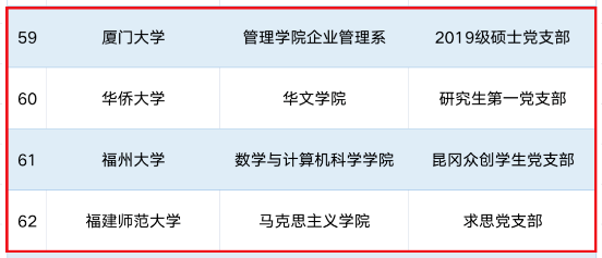 近日,教育部公布第二批全国高校“百个研究生样板党支部”和“百名研究生党员标兵”创建培育工作验收通过名单。我省厦门大学管理学院企业管理系2019级硕士生第一党支部、华侨大学华文学院研究生第一党支部、福州大学数学与计算机科学学院昆冈众创学生党支部、福建师范大学马克思主义学院求思党支部顺利通过验收。