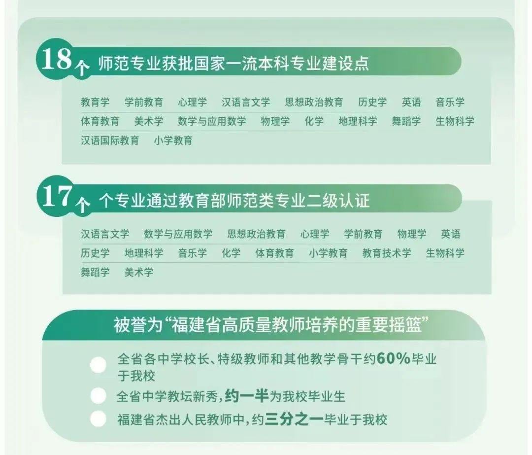 作为全国为数不多具有百年历史的师范院校,福建师范大学不断擦亮教师教育“金字招牌”,始终以培养高素质、高水平、创新型教育人才为己任,为基础教育事业立下了卓著功勋。