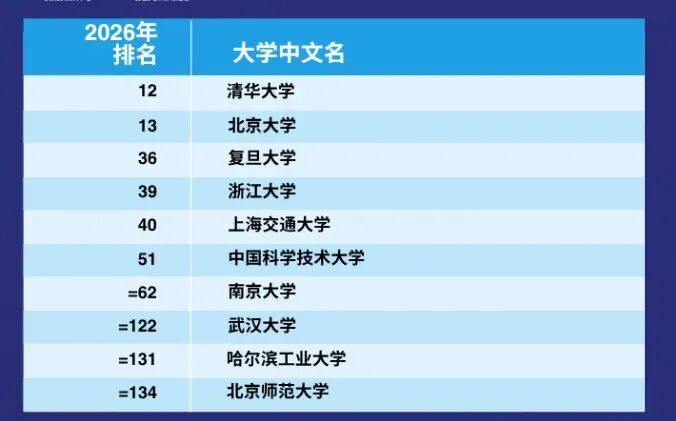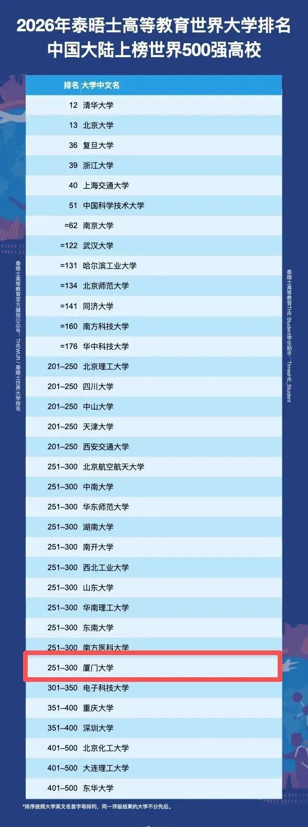 2026年泰晤士世界大学排名 今日正式揭晓 榜单显示 清华大学再次蝉联世界第12名 继续领跑中国大陆及亚洲高校 其后是北京大学、复旦大学、 浙江大学、上海交通大学 中国内地上榜高校数量 连续三年增加 从2024年86所 到2025年94所 再到2026年97所 今年厦门大学再次上榜 中国内地高校跻身全球前40强数量增至5所(去年为3所)。新晋院校包括浙江大学(从世界并列第47名跃升至世界第39名)和上海交通大学(从世界第52名升至世界第40名)。 武汉大学、哈尔滨工业大学、北京师范大学以及同济大学排名都有所提升,进入了世界前150名,往世界百强迈进。其中哈尔滨工业大学进步最大,上升了21位。 中国内地共有35所高校跻身全球前500强,数量超过澳大利亚。其中18所院校创下历史最佳排名(居世界之首)。 值得一提的是,今年深圳大学再次上榜,这所“双非”高校“藏不住”了。 据泰晤士分析,中国内地排名持续提升的驱动因素源于研究影响力与卓越研究的提升,以及授予博士学位/学术人员比例。 据了解,泰晤士高等教育世界大学排名是唯一从教学、研究、产业化及国际展望四大核心使命全面评估研究型大学的全球性排名。其采用18项精密校准的绩效指标,提供最全面均衡的比较分析,深受学生、学者、高校管理者、产业界及政府信赖。 绩效指标分为五大领域:教学(教学环境)、研究环境(发表量、研究收入与声誉)、研究质量(领域加权的引用影响力、研究实力、卓越研究与研究影响力)、国际展望(学术人员、学生与国际合著)、产业(来自行业研究收入与专利)。 |