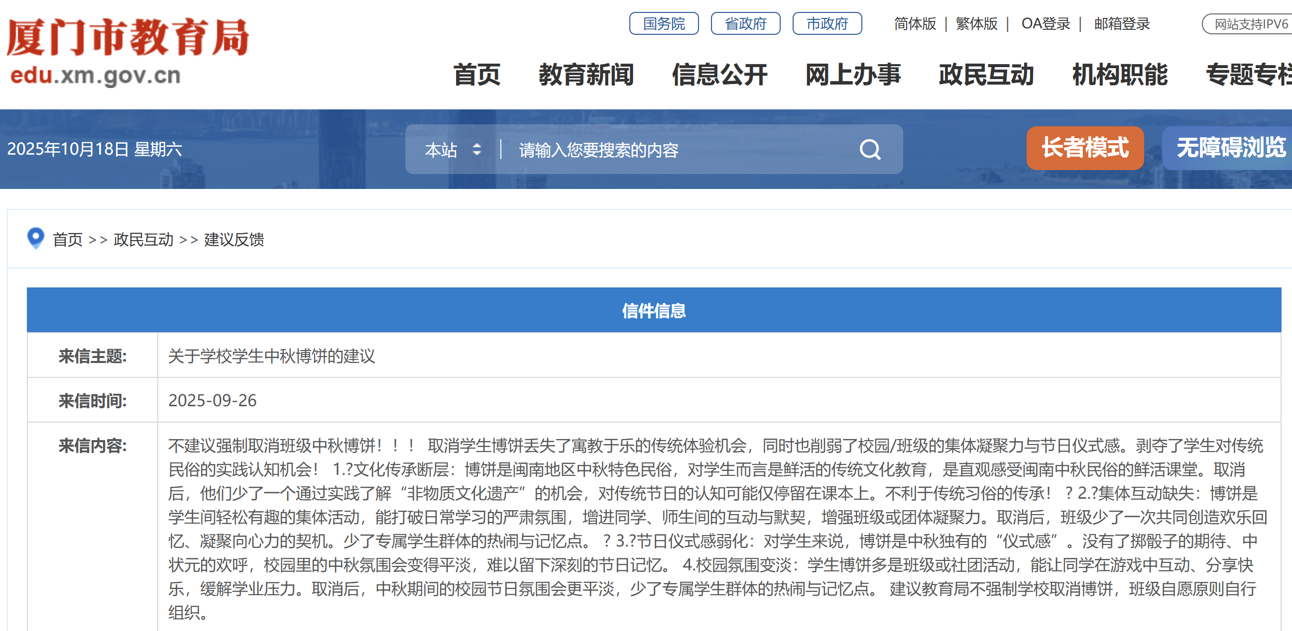 “不建议强制取消班级中秋博饼!” 近日, 厦门市教育局官网的一则来信建议 再次聚焦“校园中秋博饼禁令” 对于厦门学子而言 校内博饼曾是中秋最难忘的记忆 转折发生在2020年 厦门出台规定: 明确学校和家委会 都不得组织集体博饼 禁令背后 家长投诉与政策调整的连锁反应 追溯禁令的源头, 家长投诉成为关键导火索。 事实上, 教育部门早有规定, 学校不得出面向学生收费组织博饼。 随后,许多学校转而以家委会名义组织,但这一变通方式也因有家长投诉“变相强制参与”而被禁:2020年有家长向市教育局投诉,称家委会组织的博饼活动变相要求所有家长参加,存在“被自愿”的情况。 基于此,市教育局进一步细化规定:任何学校、班级不得以家委会名义组织博饼等活动。 由此,中秋博饼在厦门校园内几乎销声匿迹。 前几日, 有市民公开向市教育局建议: “不强制学校取消博饼, 以班级自愿原则自行组织”, 并详细罗列了中秋博饼的意义。