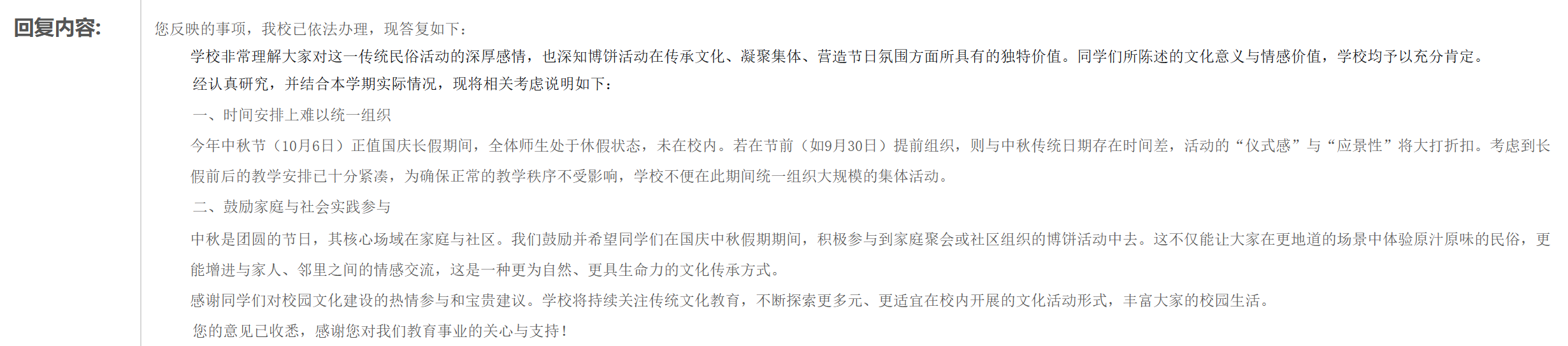 其一,时间安排上难以统一组织。今年中秋节正值国庆长假期间,全体师生处于休假状态,若在节前提前组织,则与中秋传统日期存在时间差,活动的“仪式感”与“应景性”将大打折扣,且长假前后教学安排紧凑,恐影响正常教学秩序。 其二,鼓励家庭与社会实践参与。回应中称,中秋团圆的核心场域在家庭与社区,鼓励学生参与家庭聚会或社区组织的博饼活动。 |