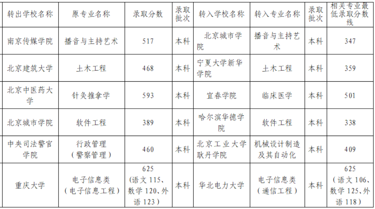▲北京市教育委员会官网截图 如:一学生从南京传媒学院播音与主持艺术专业转入北京城市学院同专业,两校专业录取线相差170分;一名学生从北京建筑大学土木工程专业转入宁夏大学新华学院同专业,录取分差达109分;还有一名学生从北京中医药大学针灸推拿学专业转入宜春学院临床医学专业,分差92分;另有一名学生从重庆大学电子信息类专业转入华北电力大学同专业,两校录取分数线持平。 去年,北京市教育委员会官网发布一则公示,清华大学本科生转向杭州电子科技大学,让不少网友震惊。当年清华大学数学与应用数学录取分数为700分,杭州电子科技大学计算机科学与技术录取分是629分,分数相差71分。 不过计算机科学与技术专业一直是杭州电子科技大学的特色专业,在全国第四轮学科评估中获得B+,与多所985高校并肩。 转学需要什么条件? 从“985工程”高校到“211工程”高校;从“211工程”高校到普通公办院校,跨校甚至跨省转学,需要满足什么条件呢?
