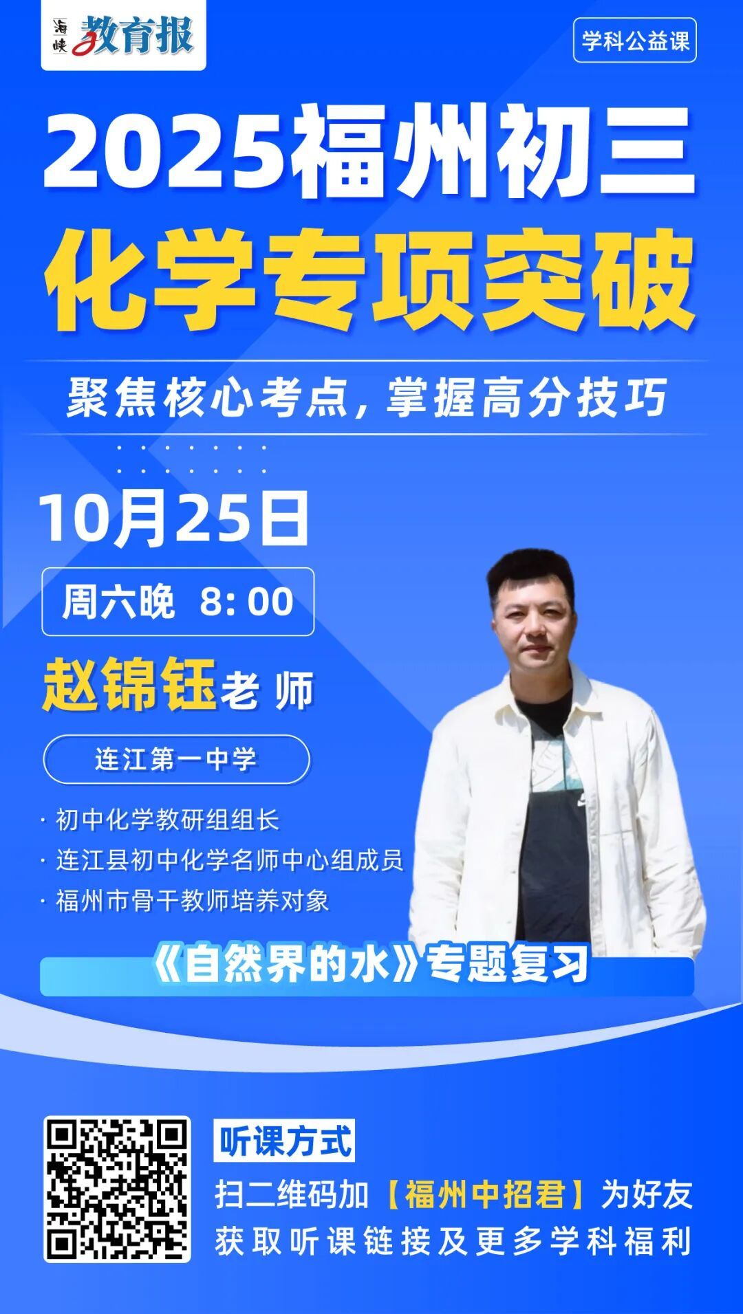赵锦钰老师将围绕“自然界的水”这一主题展开复习,通过电解水实验深入探究水的组成与结构。此外,赵老师还将介绍水质检测和自制净水器的跨学科实践活动,并结合福建中考的考情分析,精准锁定中考考查的热点,帮助学生有的放矢地进行备考。