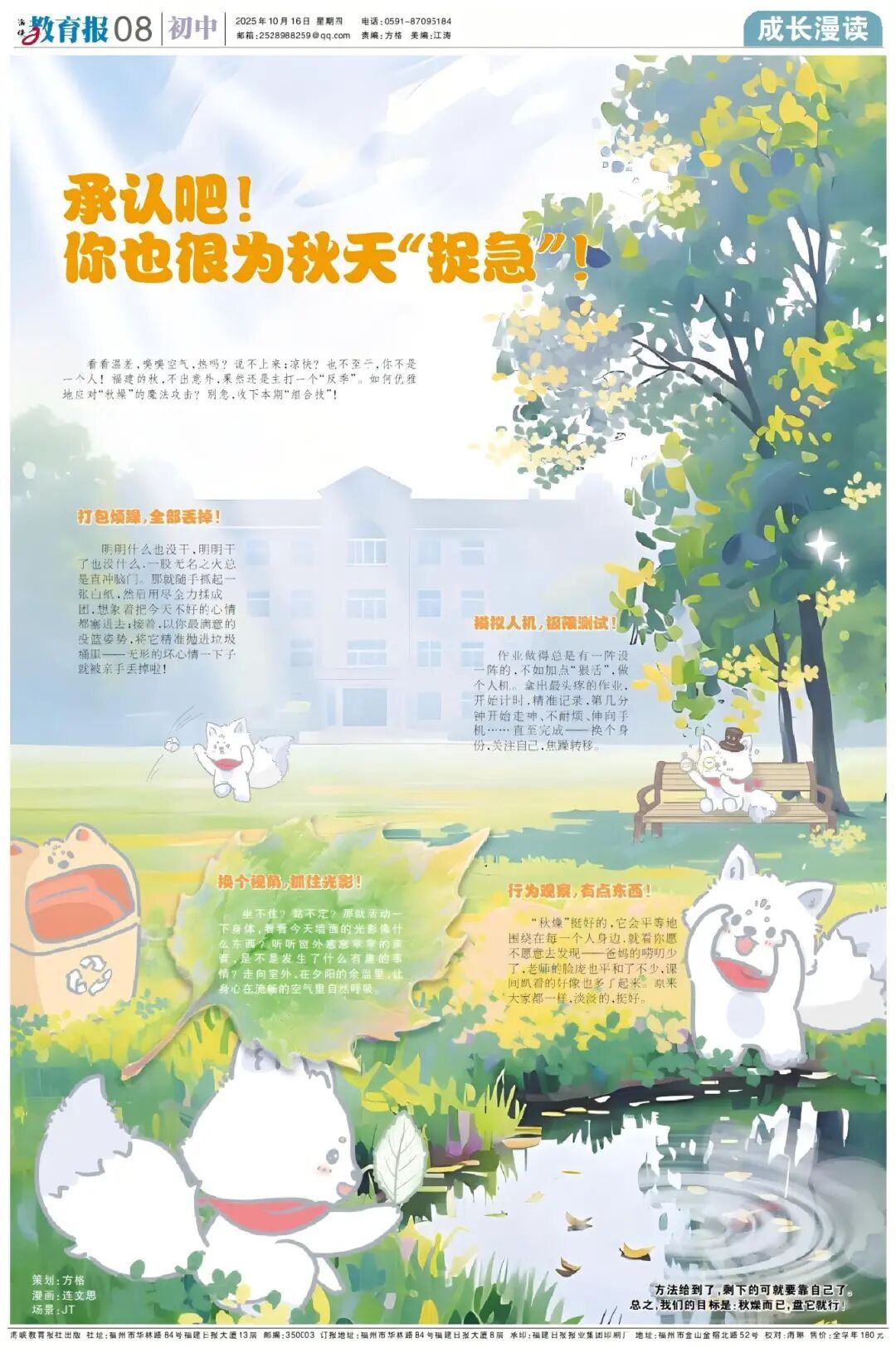 以轻松幽默的方式探讨了 秋季常见的心理状态——秋燥 并提供了应对策略 引导读者识别并调整自己的情绪 在忙碌的学习生活中找到平衡点 《海峡教育报》版面 具有丰富多彩的内容 给你带来独特的阅读体验 |