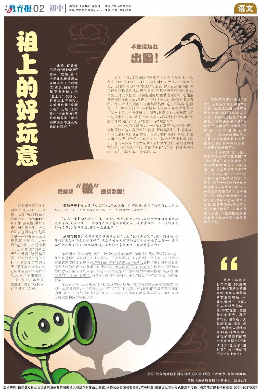 传统技艺与现代游戏的奇妙碰撞 悄然上演 皮影戏光影交错间 豌豆射手次第发射 党飞华用皮影演绎《植物大战僵尸》 在非遗技艺传承的道路上 把皮影“玩”起来 让非遗“活”起来 使得传统技艺焕发新的生机 地理版
