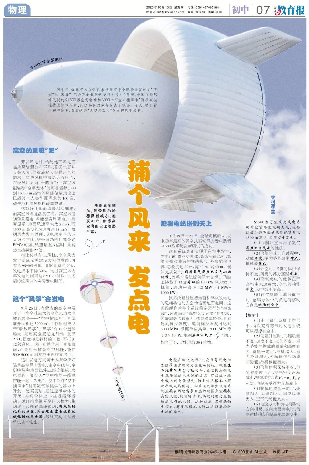 9月底 中国公布两项高空发电技术 科技感满满的飞艇在高空发电 你是否也好奇它是怎么工作的? 这可是物理不可多得的考试素材 版面内容聚焦高空风能发电技术 解释其物理原理及优势 “成长漫读”心理版