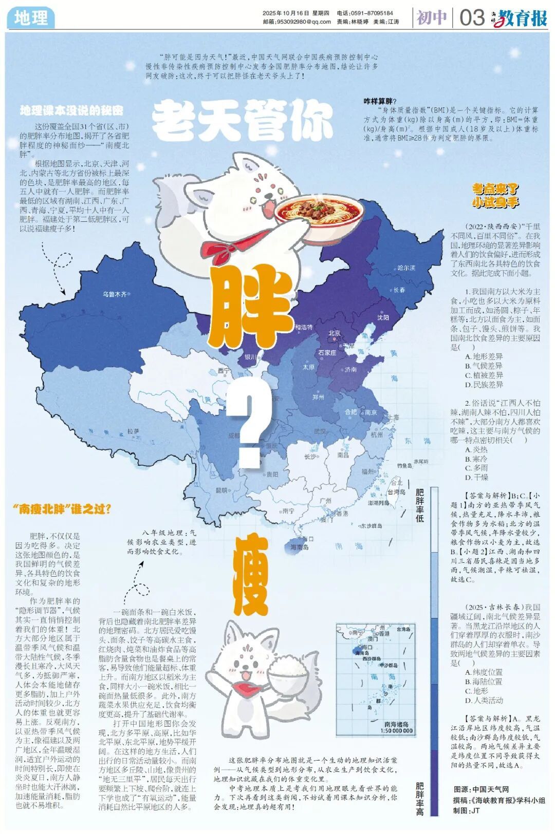 肥胖可能是因为天气? 全国肥胖率分布地图 让网友破防 基于这个网络热点 版面内容从地理角度 探讨肥胖率与地理环境的关系 从气候、饮食等学科考点 解释某些地区的人更易发胖的原因 数学版