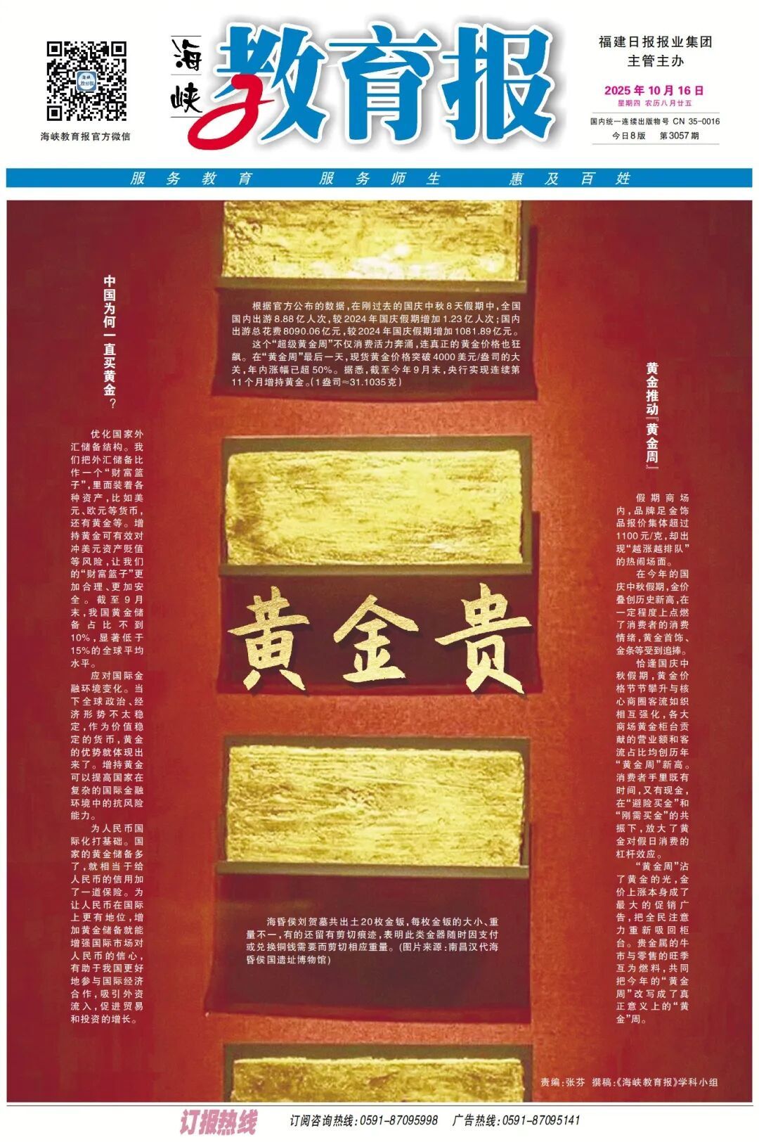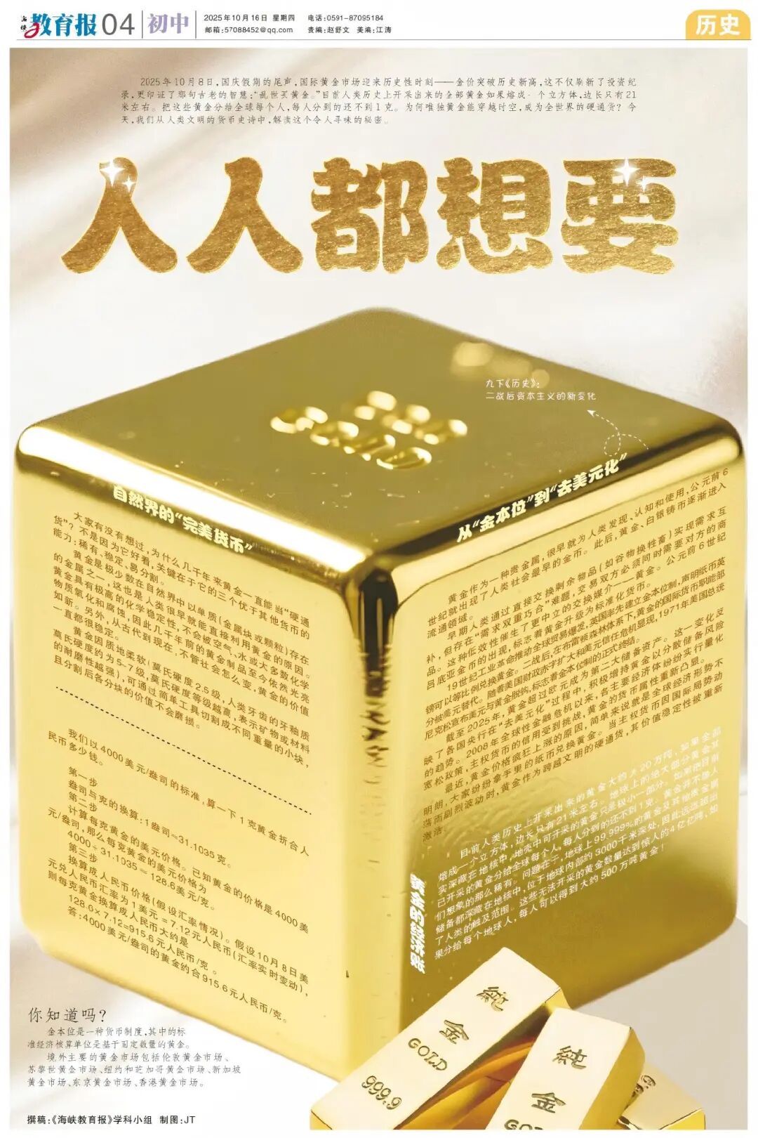 十一超级黄金周 不仅是消费活力火热 黄金价格也一路狂飙 结合黄金热点 《海峡教育报》从学科角度 梳理道法、历史、化学考试要点 让孩子了解经济知识,培养财商 道法版