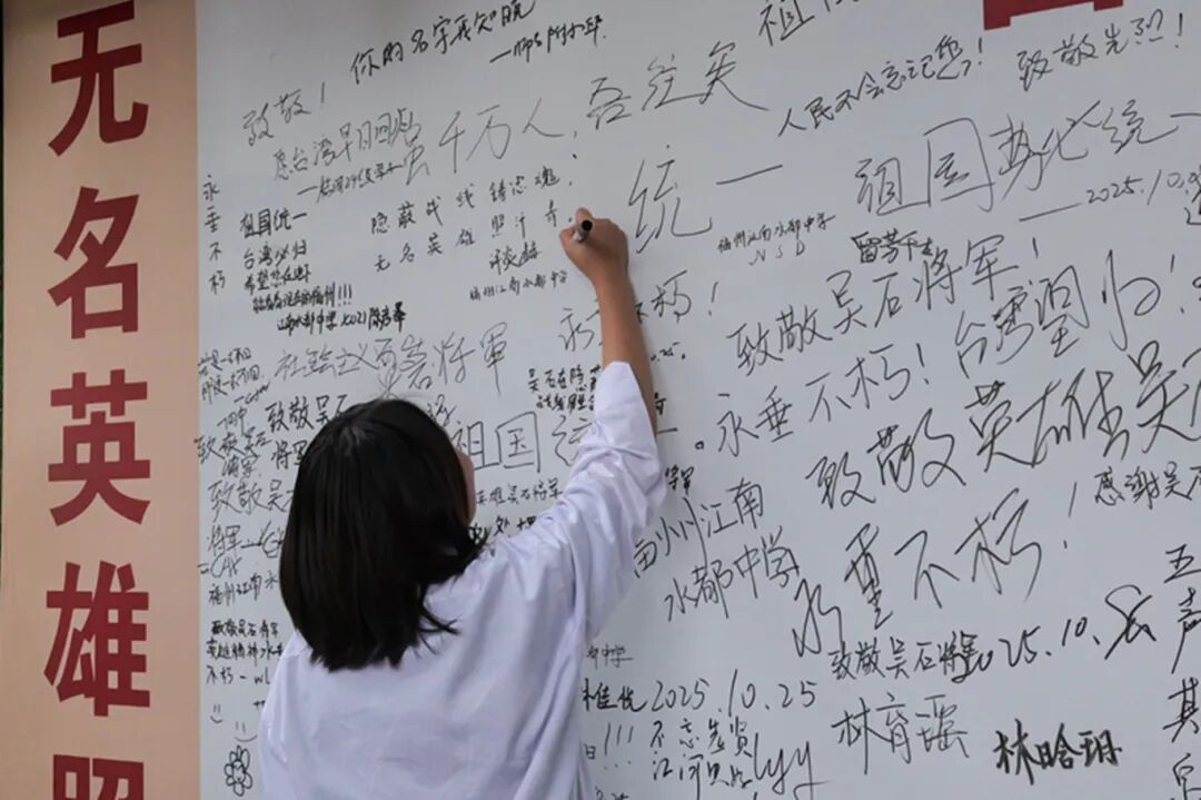 活动中,两岸学子共同为吴石将军献花、鞠躬致敬,表达对英雄的缅怀与敬意,并在留言墙上写下“山河无恙,祖国统一;无名英雄,永垂不朽”等参访感悟,完成了一场与将军的跨时空“对话”。 此次活动不仅深化了两岸学子对国家历史与民族精神的理解与认同,更激发了大家携手传承红色基因、弘扬爱国传统的使命感。 台籍学生蔡盛琋动情地说:“吴石将军以碧血丹心染红台海天际,以宝贵生命呼唤祖国统一。当落霞映红远方的天空,我们依旧坚定地站在这里。未来,我们将潜心向学,勇往直前,担当时代重任,用实际行动促进两岸交流融合,为实现中华民族伟大复兴的中国梦贡献青春力量!”