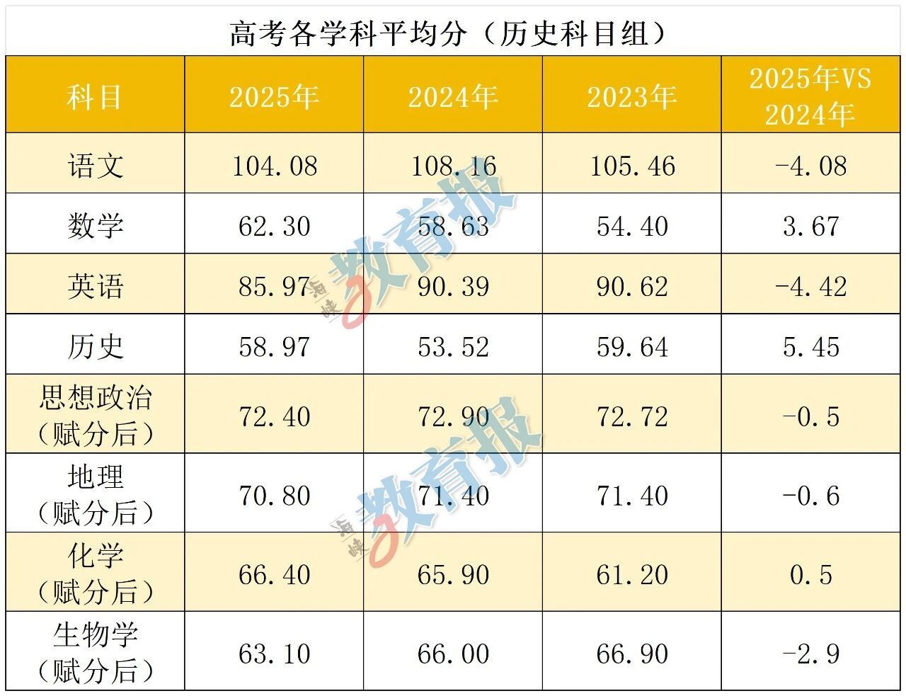 再来看看历史科目组,如表所示,2025年数学学科平均分比2024年提高3.67分;语文、英语学科则较2024年分别低了4.08分和4.42分。 以“史政地”组合为例,汇总平均分,2025年为454.52分,比本科切线450分多出4.52分;2024年为455分,比本科切线431分多出24分;2023年为454.24分,比本科切线453分多出1.24分。 再以“史政生”组合为例,汇总平均分,2025年为446.82分,比本科切线还低了3.18分;2024年为449.6分,比本科切线高18.6分;2023年为449.74分,比本科切线低3.26分。 对比近三年发现,2024年是历史科目组最为优势的一年,当组合里各学科达到高考平均分,就比切线高出十几二十分。反观2025年,“史政地”汇总平均分仅多切线4.52分,“史政生”组合甚至够不上本科线。 对于历史科目组学生而言,综合考虑院校招生计划等因素,即便各科分数都达到全省平均分,也没有太大优势上本科。 最后想说的是 何以破解? 唯有静下心,继续努力 在离高考200多天里 扎扎实实打好基础 加油! |