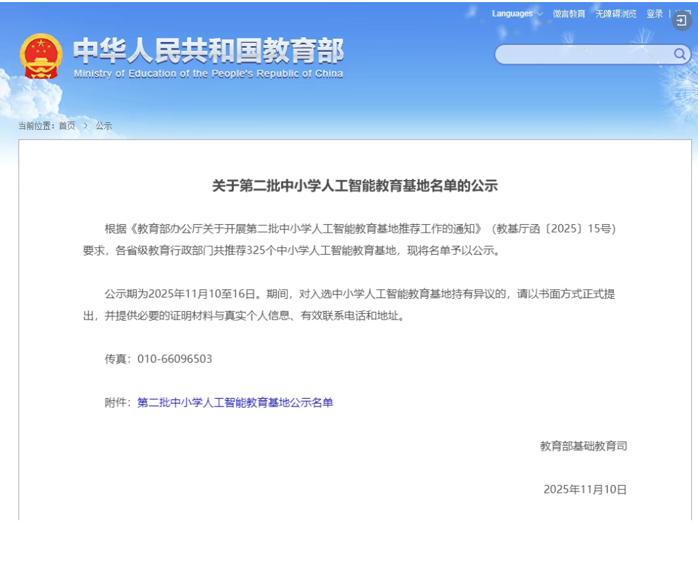 根据《教育部办公厅关于开展第二批中小学人工智能教育基地推荐工作的通知》(教基厅函〔2025〕15号)要求,各省级教育行政部门共推荐325个中小学人工智能教育基地,现将名单予以公示。 公示期为2025年11月10至16日。期间,对入选中小学人工智能教育基地持有异议的,请以书面方式正式提出,并提供必要的证明材料与真实个人信息、有效联系电话和地址。 传真:010-66096503 教育部基础教育司 2025年11月10日 |