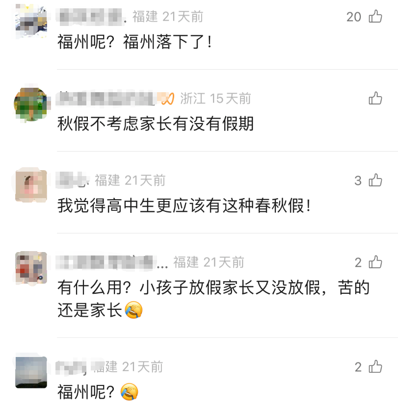 从目前看,福建在探索中小学春秋假方面还没啥动静。 推行春秋假的主要难点在于:如果家长无法同步休假,假期就难以落实。 以杭州为例,即便已实施春秋假,学校仍会因家长无法陪孩子而面临投诉,往往需要提供托管服务。 此前九部门也提出,要“探索职工带薪休假”,正是希望推动假期协同。目前已有春秋假的城市一般只安排2—3天,与周末、五一、国庆等连用,尽量不影响原有假期结构。 |