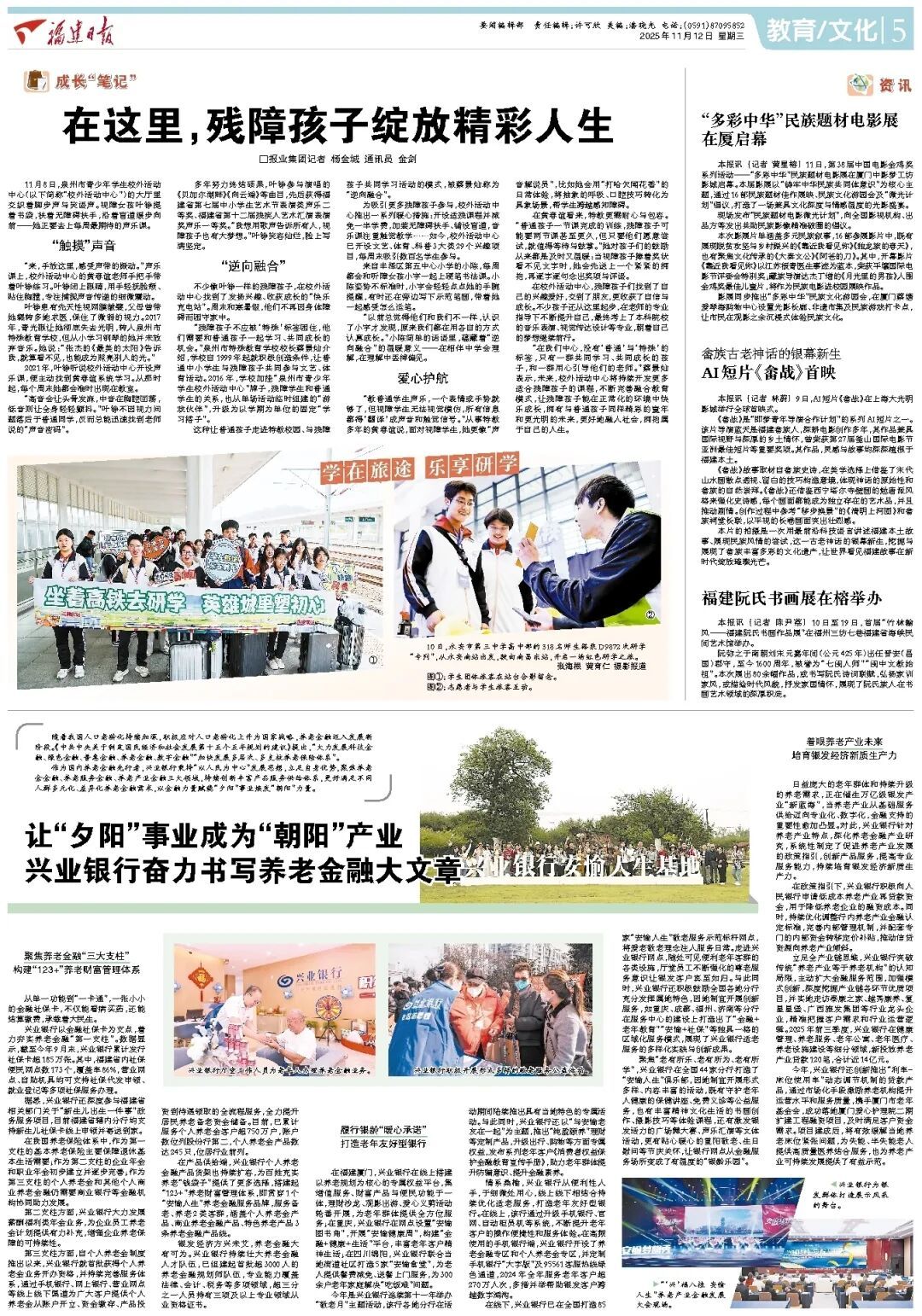 今日,福建日报报纸版面第5版刊发教育全媒体中心记者杨金城的文章——《在这里,残障孩子绽放精彩人生》。文章关注泉州残障孩子,在校外活动中心找到了发扬兴趣、收获成长的“快乐充电站”。
