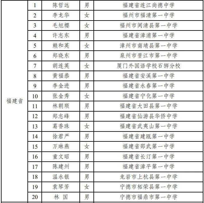 近日,教育部网站发布《关于公布全国县域普通高中头雁教师岗位计划人选的通知》指出,经学校自主申报、省级教育行政部门审核公示、等额推荐、会议评议确定首批全国县域普通高中头雁教师岗位计划入选教师600人,现将名单予以公布。 其中,福建共有20位教师入选。 具体名单如下 ▼▼
