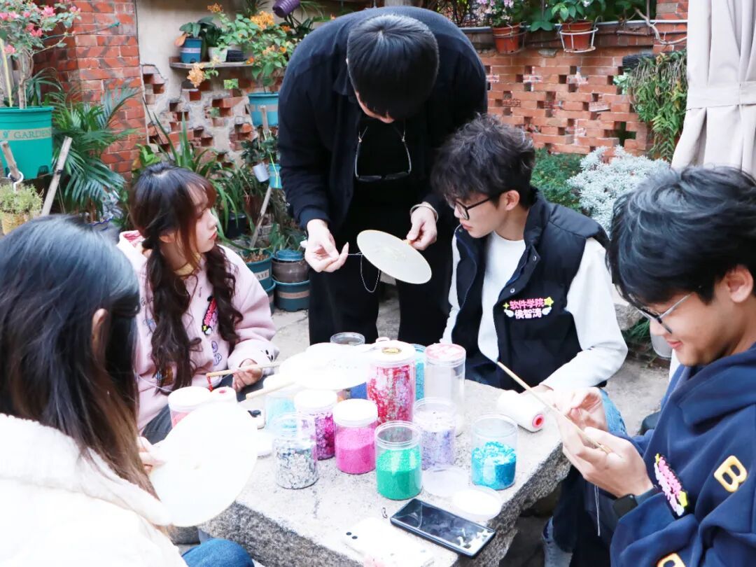 隔壁的非遗体验区,非遗传承人吴小橙正用团扇亮片等做一把珠绣“金鱼”。创意设计学院的黄思雨、机械与电气工程学院的曾菲洋在老师指导下,很快绣出了雏形。软件学院的侯智涛和机械与电气工程学院的周轩全虽然都是男生,手上的巧劲不比女生差。看着金光闪闪的图案,他们纷纷感慨:“上世纪50年代归侨带回的手艺,早把两地文化绣进了针线。”