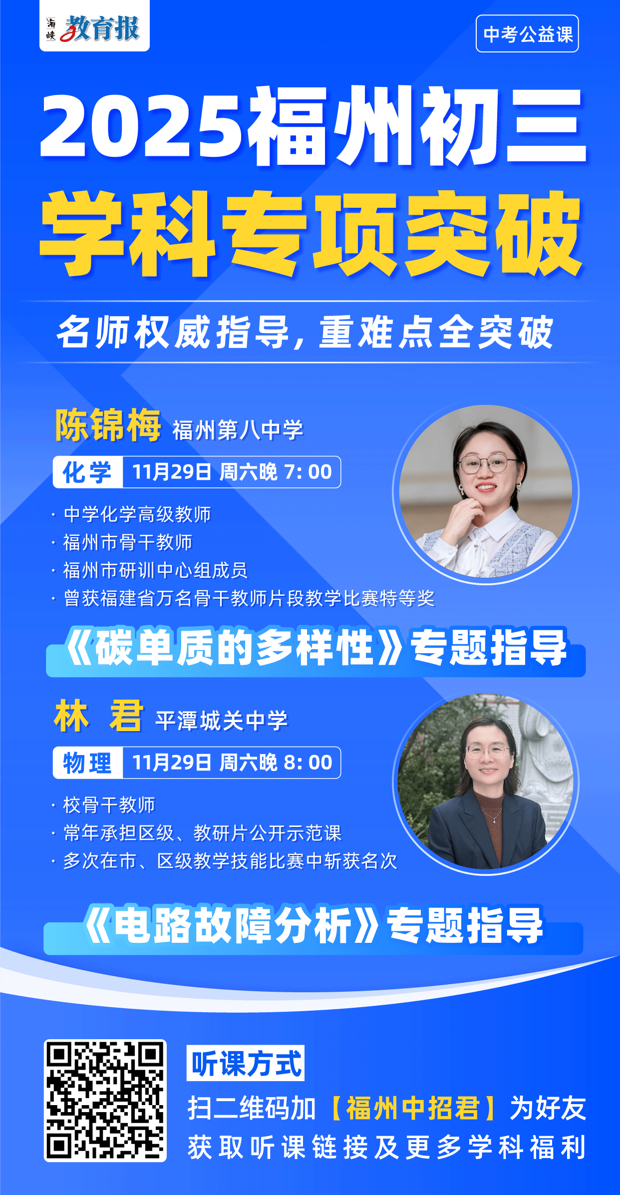金刚石能切割玻璃 石墨却质软滑腻 为什么都由碳元素组成 却有着完全不同的 物理性质? 电路故障分析 是物理考试中 选填题型的重难点 如何提升解题效率? 这类题型有何解题技巧? 本周六晚7时开始 海峡教育报公益直播课 将邀请 福州第八中学 陈锦梅老师 深入讲解碳单质的多样性 平潭城关中学 林君老师 为同学们梳理电路故障的 分析思路、解题策略