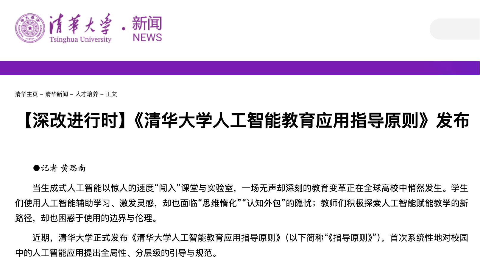 近期,清华大学正式发布《清华大学人工智能教育应用指导原则》(以下简称《指导原则》),首次系统性地对校园中的人工智能应用提出全局性、分层级的引导与规范。