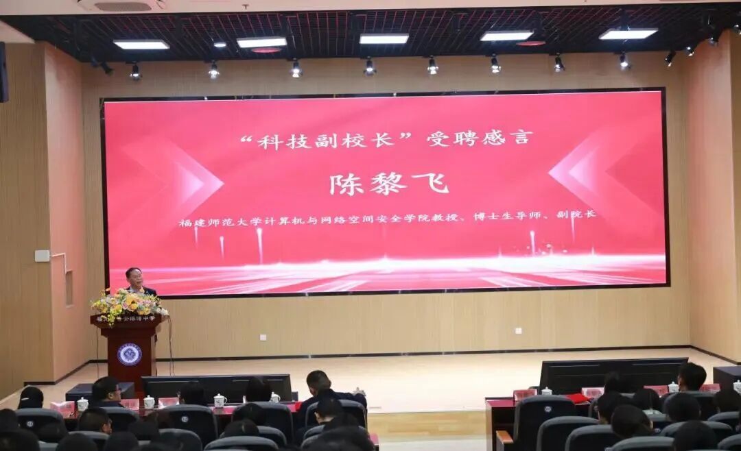 晋安榕博小学党总支副书记江芝芬作为成员校代表发言,表明将以榕博精神为纽带,以共同体为依托,主动融入、积极作为,为培养担当民族大任的时代新人,贡献新的更大力量。 科技赋能: 聘任科技副校长 福州第十中学聘任福建师范大学计算机与网络空间安全学院陈黎飞教授为“科技副校长”,助力学校科技创新教育提质增效。