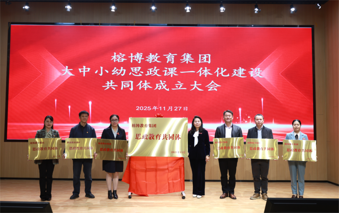▲全体人员起立,齐声高唱《歌唱祖国》 “榕博教育集团大中小幼思政课一体化建设共同体”的成立是贯彻党的二十届四中全会精神,落实新时代立德树人根本任务的重要举措,是推动思政教育从“碎片化”走向“系统化”、从“分段教”迈向“全程育”的关键一步。 未来,榕博教育集团将构建一体化课程体系,打造专业化思政教师团队,开展跨学段联合教研,推出系列特色品牌活动,真正实现“各学段有机衔接、各主体协同发力、全过程协同育人”的目标。