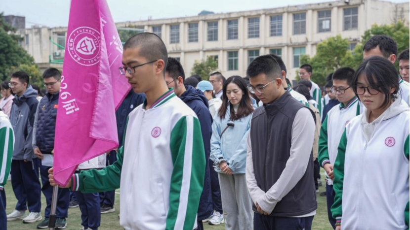 抵达福州宦溪中学后,爱国主义教育仪式庄重举行。福州第八中学党委书记林晓枫、副校长伍兴武等校领导出席本次活动,与全体师生及家长志愿者一同见证这一庄严时刻。高三国旗班整齐出旗,全场肃立奏唱国歌。国歌毕,全场默哀一分钟,深切缅怀南京大屠杀死难者及所有抗战英烈。德育处副主任朱永钦在主题发言中,回望莲花峰阻击战的壮烈史实,阐释国家公祭日的设立意义,勉励学子将个人前途与国家命运紧密相连,以奋斗守护和平。随后,教务处主任刘国伟带领全体学子宣誓:“以史为鉴,铭记先辈苦难;以行践言,勇担时代使命……冲刺高考,不负韶华;强国有我,不负人民!”誓言铿锵,彰显青年担当。