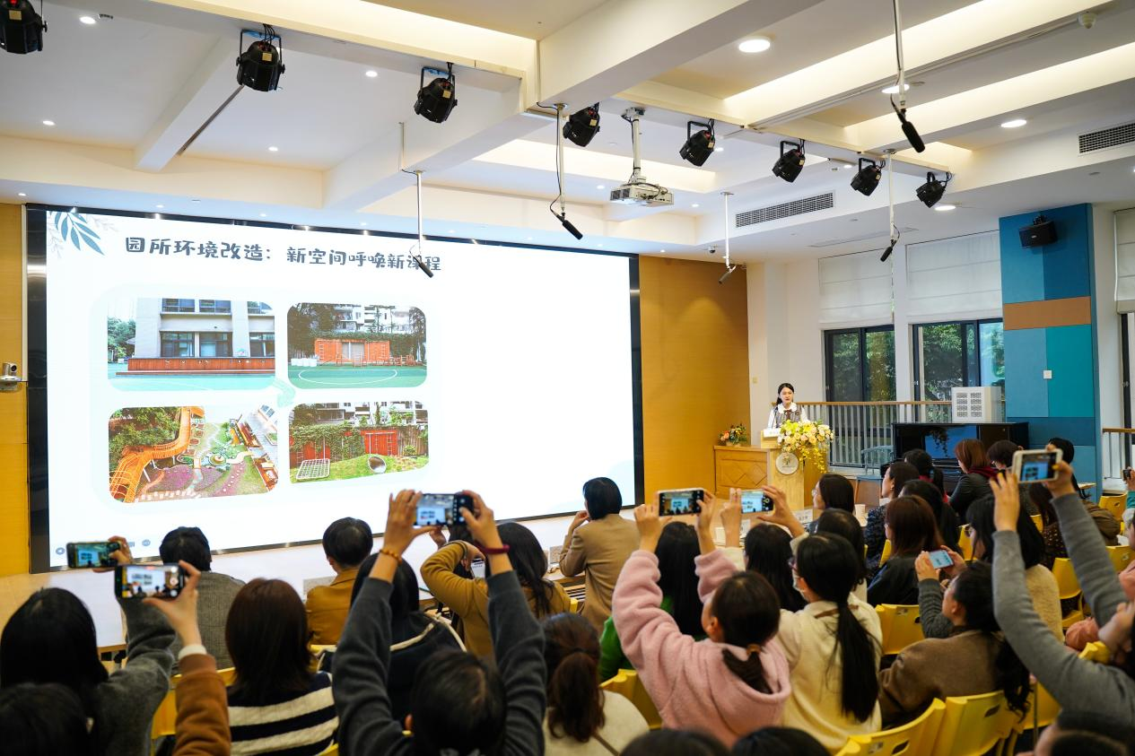 晨间户外活动观摩环节,园所多元、适宜、可探究的环境与幼儿自主、愉悦的游戏场景,不仅处处凸显着“儿童友好”理念在园所的实践落地,更以丰富的场景和开放的形态,为课程生发及幼儿学习发展提供了无限可能,让“环境即第三位教师”可感可触,生动呼应了儿童友好城市建设中“成长空间友好”的政策导向。