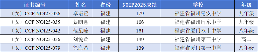 刚刚 全国青少年信息学奥林匹克联赛 NOIP(省赛) 2025获奖名单公示 福建95人获一等奖 其中,福州选手有44人 占比约46% NOIP 2025 福建一等奖名单