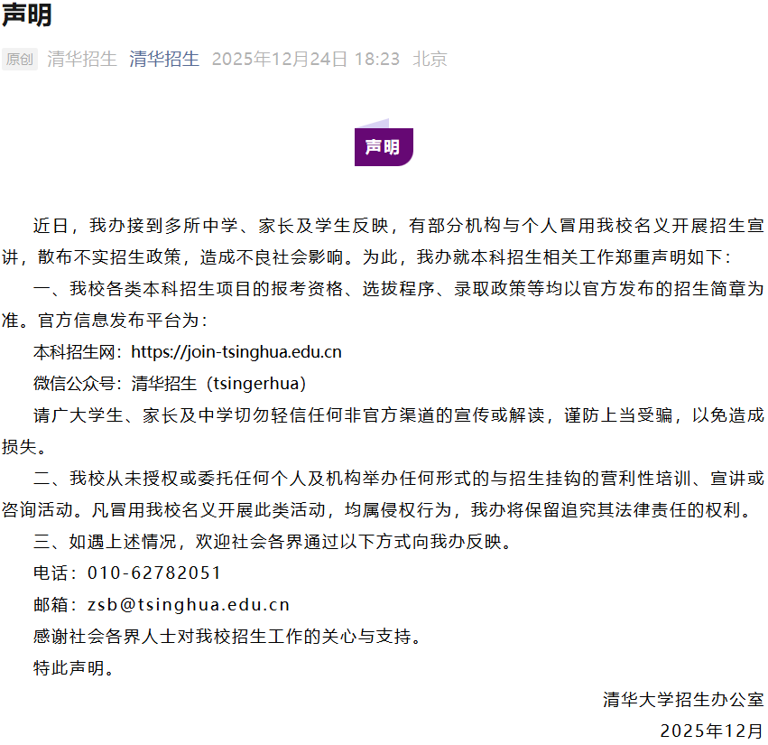 12月24日,清华大学招生办公室发布声明称,清华大学招生办近期接到多所中学、家长及学生反映,有部分机构与个人冒用清华大学名义开展招生宣讲,散布不实招生政策,造成不良社会影响。 招生办就本科招生相关工作郑重声明称,清华大学从未授权或委托任何个人及机构举办任何形式的与招生挂钩的营利性培训、宣讲或咨询活动。 声明指出,凡冒用清华大学名义开展此类活动,均属侵权行为,清华大学招生办将保留追究其法律责任的权利。