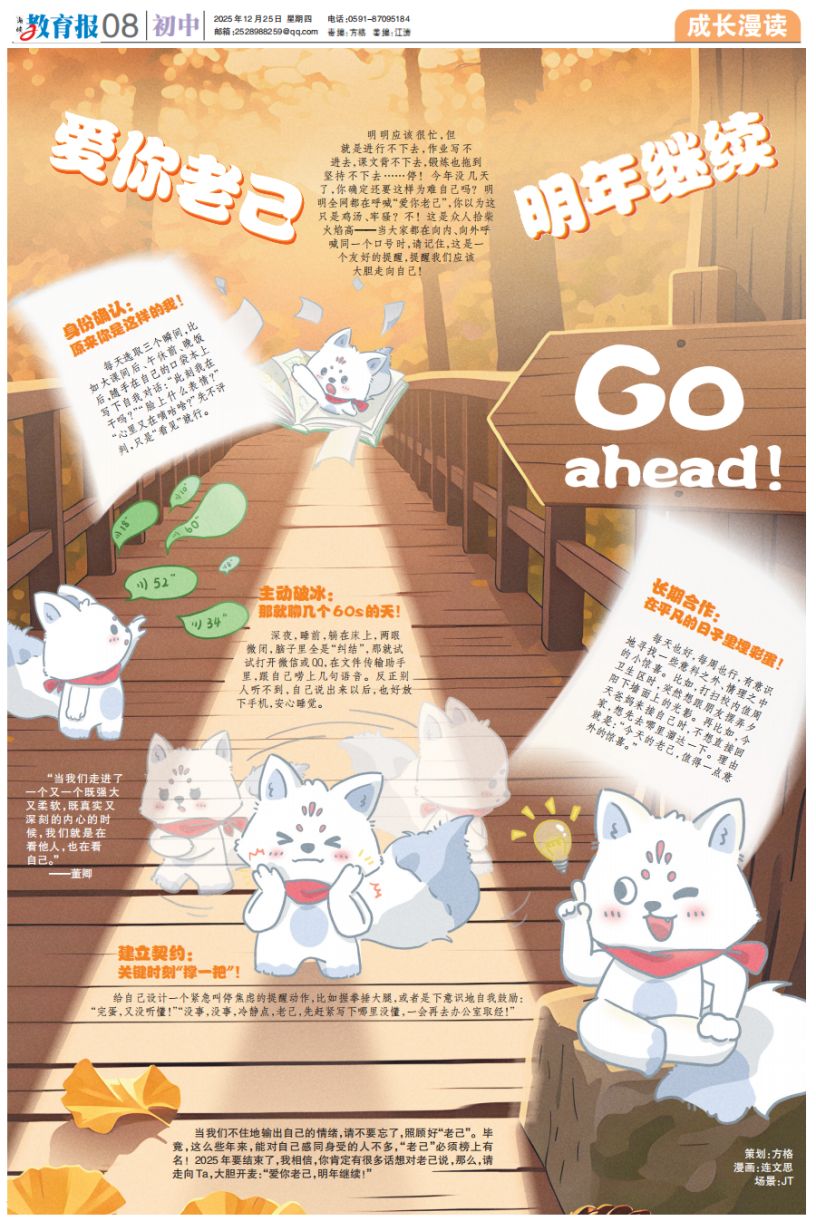 在平时例行的轨道里 有意识地寻找一些 意料之外、情理之中的小惊喜 比如,今天天气还行 作业也做得差不多了 爸妈也有空 喊上一起去哪里溜达一下 理由就是: “今天的老己, 值得一点意外的惊喜。” 2025年要结束了 我相信,你肯定有 很多话想对老己说 那么,请走向Ta 大胆开麦: “爱你老己,明年继续!” (学生健康教育工作室出品) |