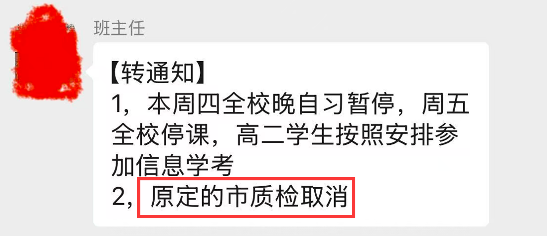 最新消息 福州取消高一、高二质检? 据福州一高中家长反映 学校发布通知称 原定市质检取消