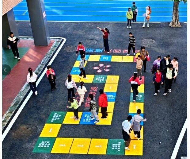 去年,学校累计投入超200万元改造设施,重修田径场、篮球场与室内场馆,更将停车场升级为室内风雨运动场。 在学校大课间,操场空地上彩绘的跳格子、数字路径等,悄然吸引孩子们投身户外活动,四处洋溢着欢声笑语。学校引入的AI体育测训机,成了孩子们喜爱的“智能伙伴”,它支持高抬腿、深蹲、跳绳等多种体能项目,通过摄像头精准识别动作、自动计数并生成数据,以科技手段激发学生的运动兴趣。
