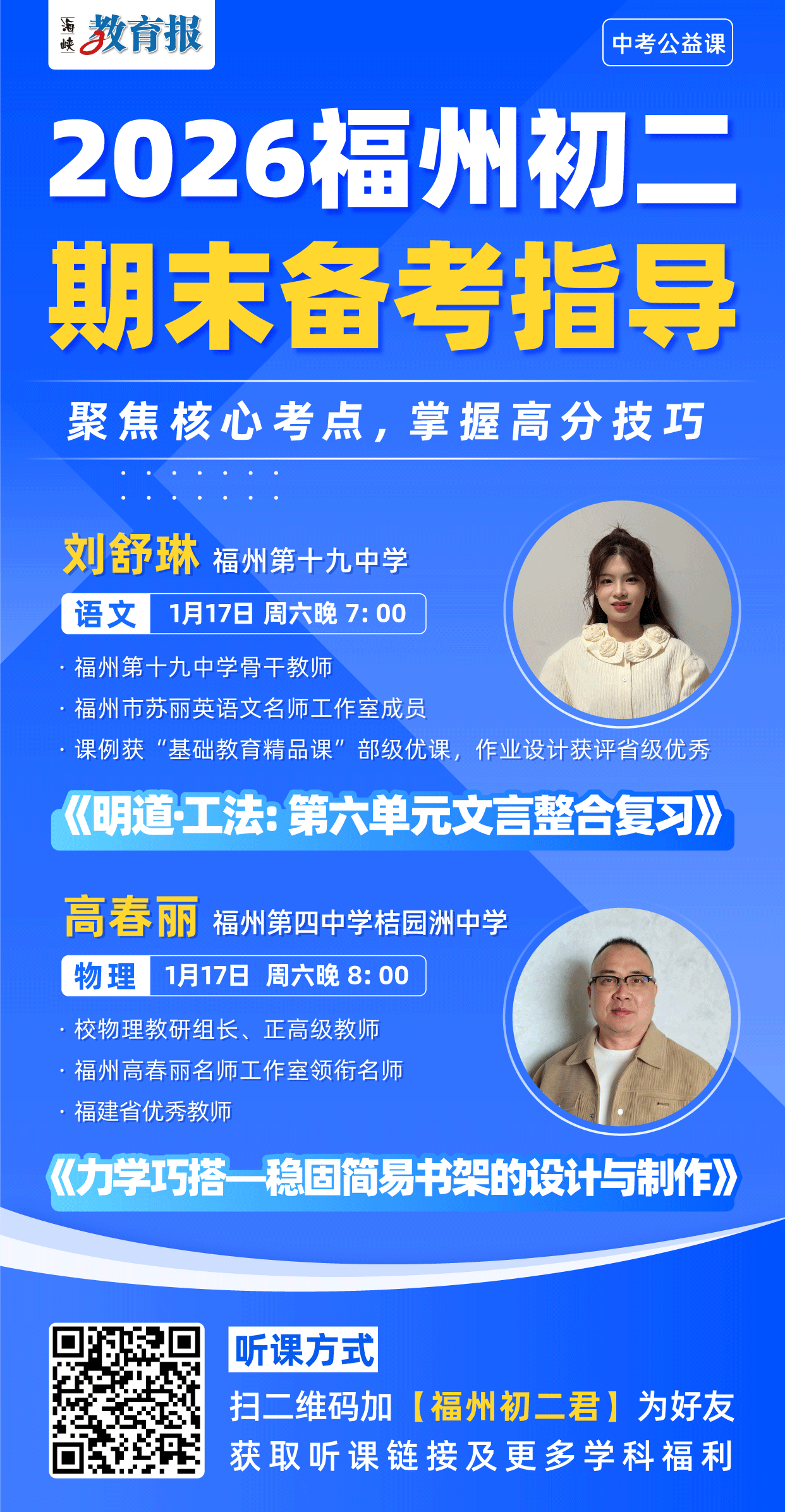 你是否曾因 一词多义而困惑? 是否在翻译时 因句式复杂而卡壳? 文言文专题 死记硬背的时代已结束 理解与迁移能力 才是学习的核心 物理期末考试中 力学占据重要地位 新课标强调“跨学科实践” 力学相关的综合实践活动 成为考查重难点 别担心 方法总比困难多! 本周六晚 海峡教育报公益直播课 语文×物理双线并进 邀请 福州第十九中学 刘舒琳老师 针对语文学科传授 文言文专题复习策略 福州第四中学桔园洲中学 高春丽老师 针对物理学科 带来力学专题复习策略