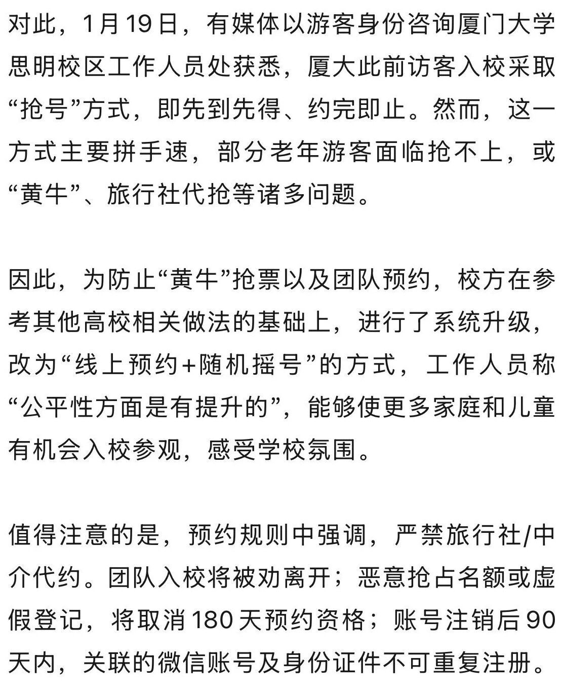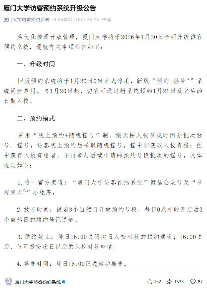 本报记者查询“厦门大学访客预约系统”微信公众号发现确有公告表示:厦门大学旧版访客预约系统将于1月20日0时正式停用新版“预约+摇号”系统同步启用。