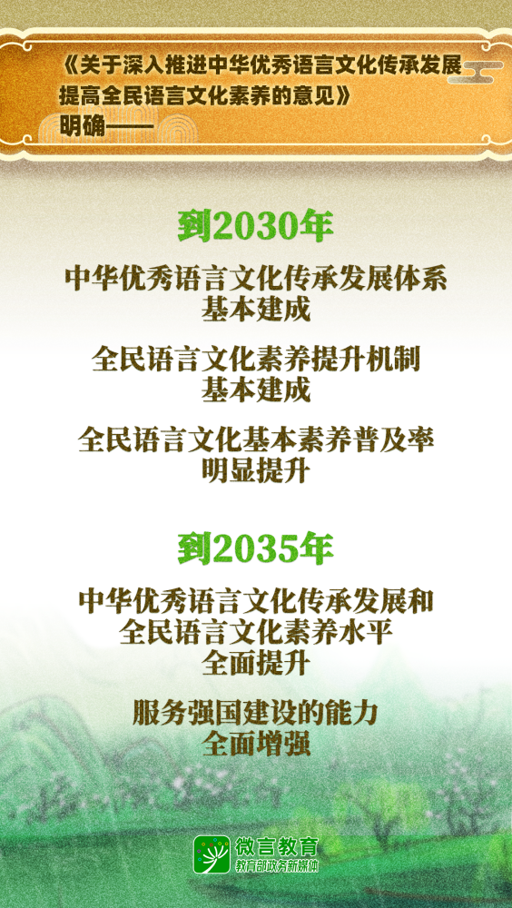 近日,教育部、国家语委、中央宣传部、中央网信办、文化和旅游部、国家文物局、共青团中央印发《关于深入推进中华优秀语言文化传承发展 提高全民语言文化素养的意见》(以下简称《意见》)。一起来看——
