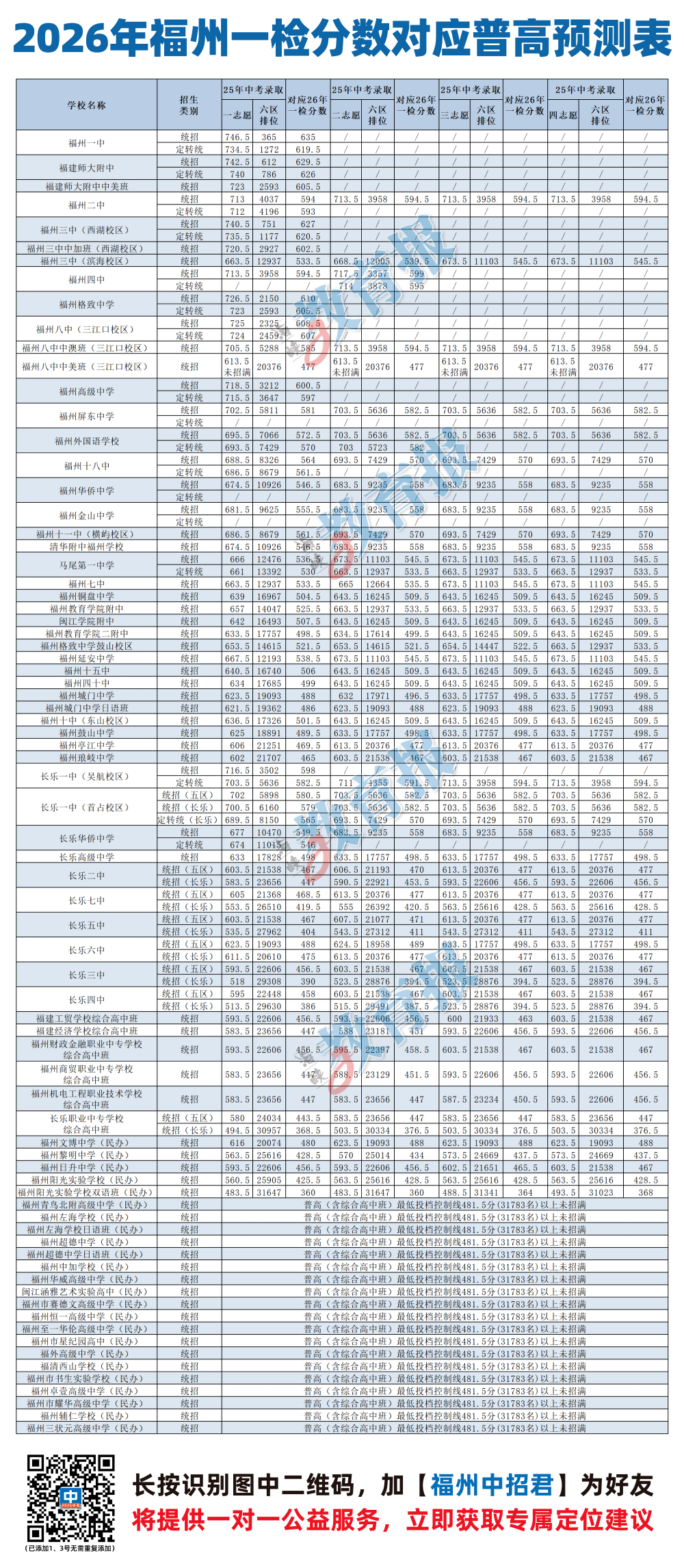 2025年,在定向生比例提高的基础上,一中、附中、三中(西湖校区)统招最低位次在1200名以内,对照2026年“一检”排位,大约620分以上的考生可以冲刺。 考虑“老八所”的考生,参考2025年这8所普高统招一志愿最低位次在4200名以内,对照2026年“一检”排位,大约593分以上。 考虑有定向生指标的屏东、外国语、十八中、马尾一中、金山、华侨这6所一类校的考生,参考2025年统招一志愿最低位次在1.3万名以内,对照2026年“一检”排位,大约535分以上。 如果你不懂得 如何利用排位表 进行自我定位 请扫码添加 【福州中招君】为好友 将提供一对一公益服务 立即获取专属定位建议