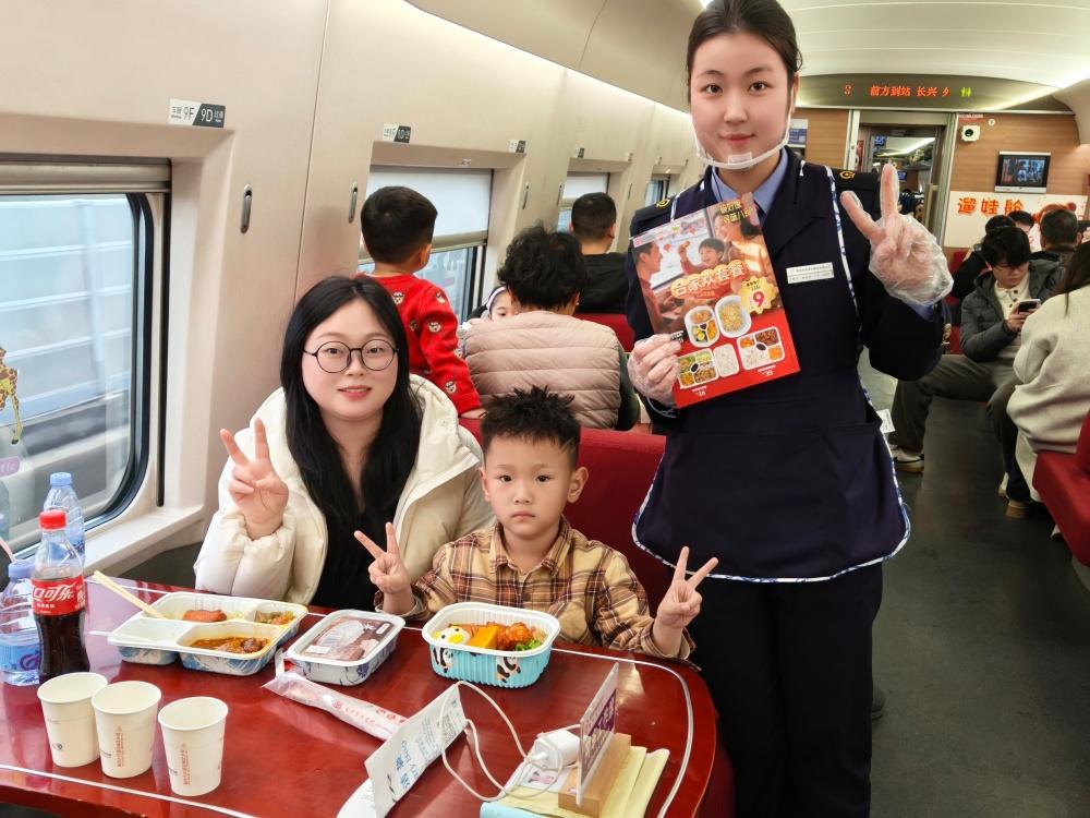 2月7日中午,G1672次列车正平稳驶向南京。车厢内,旅客王女士和儿子刚刚用完午餐,餐盒里的“合家欢套餐”吃得干干净净。“味道很好,价格也合理,点赞!”她笑着对前来询问的餐服长张桂香说道。餐车上,各式包装精美、热气腾腾的套餐正被送往不同座位,车厢里弥漫着饭菜香气与浓浓暖意。