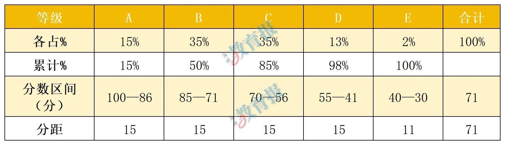 ▲全国卷5年和新高考5年比较(表二) 为什么新高考分数线有“高、稳、小”的特点? 主要原因是新高考的赋分是原始分+等级分。 分数线的高低与试卷难易、招生计划、切线比例三者相关,在后两个因素相对稳定的情况下则主要与试卷难易相关。在全国卷5年时间里,试卷难易由“3+综”六科的难易共同决定。在新高考5年时间里,表面上也是由六科共同决定,但由于“+2”的四科是等级分(见表三),固化了分数分布;而且“A级+B级”的人数占该科考生人数的50%,即居于人数的中位数,它对应的等级分是71分,因此“+2”学科平均分基本稳定在71分上下且各年波动小,与试卷难易、哪一学科、哪一年无关(如表四)。 这样,“+2”学科的难易对分数线的波动几乎没有影响或影响甚微,因此影响新高考分数线波动的因素由六科减为四科,即主要是“3+1”四学科。 按照全国卷,物理、历史、化学、生物、政治、地理六科的原始分多在50分~60分之间(难度值0.55上下)较为合适;而新高考“+2”四学科使用等级分,它们的平均分提高到71分上下,即每科提高了十几二十分,两科合计提高了20多分甚至30分之上,所以新高考分数线有“高”的特点。 同时,因为“+2”两科分数分布基本不变,所以基本不影响分数线高低的变化,因此新高考分数线有“稳”的特点,自然就有波动“小”的特点。此外,语数英三科为全国命题,其难度也越趋稳定,也是重要原因。详细分析戳《海峡教育·招考直通车》此前报道:考生注意啦!这样做总分就能最大化!
