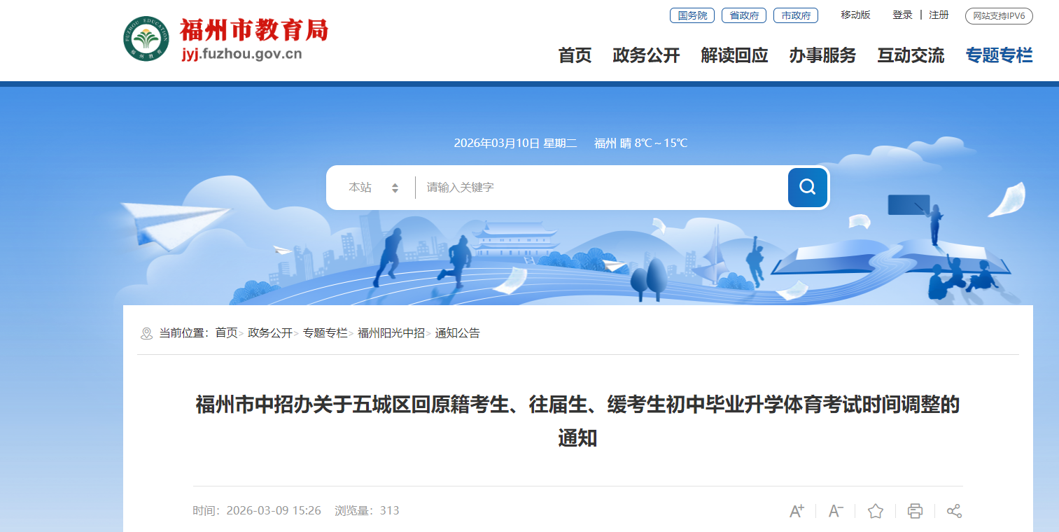 昨天(3月9日),福州市中招办发布通知称,因全市九年级质检、八年级地理生物质检时间为5月6—8日,为保障考生权益,原定于5月6日进行的五城区回原籍考生、往届生、缓考生初中毕业升学体育考试时间调整至5月9日,延后了3天。 同一天,2026年福州市体育中考方案发布。 记者梳理发现,除了“三大球”(篮球、足球、排球)从“抽考”调整为“选考”,报名、考试时间等内容也有所调整。 考试方案中 有哪些需要重点关注的事项? 相比去年 具体还有哪些变化呢? 01考试时间调整 方案显示,今年体育考试时间均有所调整: 鼓楼区、台江区、仓山区、晋安区、马尾区及省、市属有关学校的考试时间为4月10日至25日(26日—30日机动备考)。 缓考的考生、回原籍考生、往届生考试时间为5月9日。 长乐区体育中考须与五城区同步完成,其他县(市)区初中毕业升学体育考试在5月11日前完成。