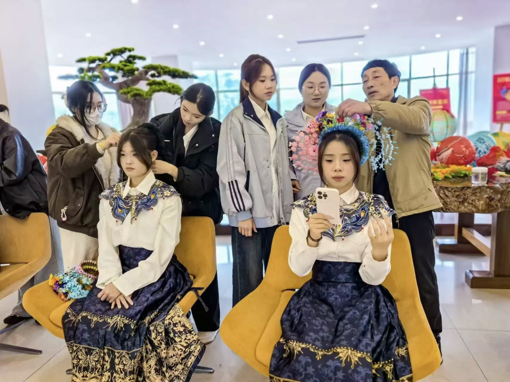 与此同时,簪花体验区亦是春意盎然。蟳埔女头饰的姹紫嫣红间,学校新成立的簪花社团开启了第一堂实践课。在传承人指导下,同学们学习如何将绒线茉莉斜插出“头顶花园”的灵动。丰泽区马年专属IP“簪花马”也现身校园,这匹头戴明艳簪花围的骏马瞬间成为师生合影的“网红”。从版画印制到提线木偶表演,再到亲手滚制一碗闽南元宵,学生们在沉浸式体验中,完成了从旁观者到传承者的身份转变。 古桥“潮”起来 设计作业变成抢手货 如果说游园会是美育的感性熏陶,那么专业课堂上的理性创新,则是泉州信息工程学院美育浸润的更深层实践。