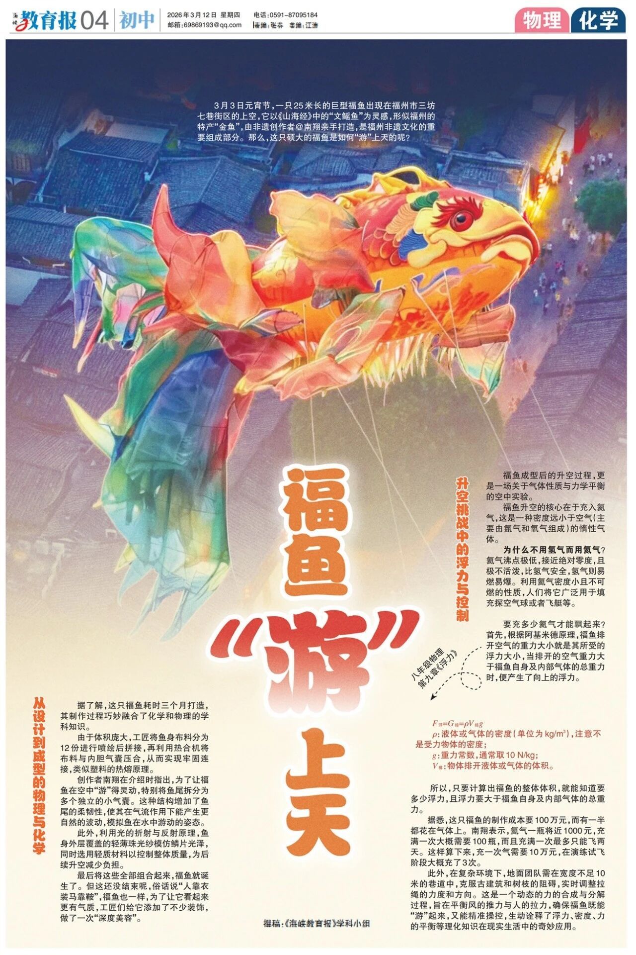 福鱼“游”上天 25米长巨型福鱼 元宵夜现身三坊七巷上空 这只福鱼 究竟是如何“游”上天的? 用物理和化学知识来解释